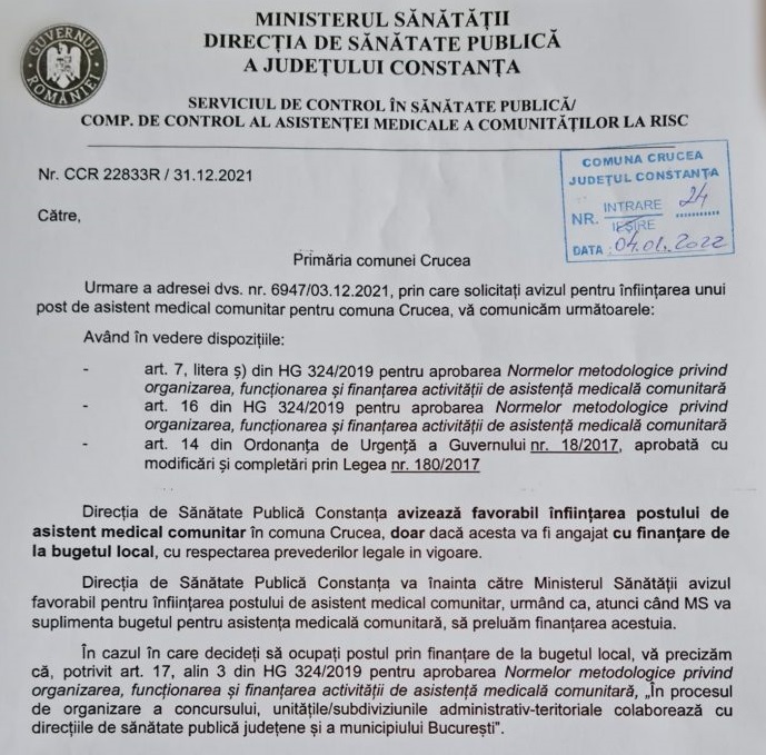 Direcția de Sănătate Publică (DSP) din Constanța a avizat favorabil solicitarea Comunei Crucea de înființare a Centrului Medico-Social.