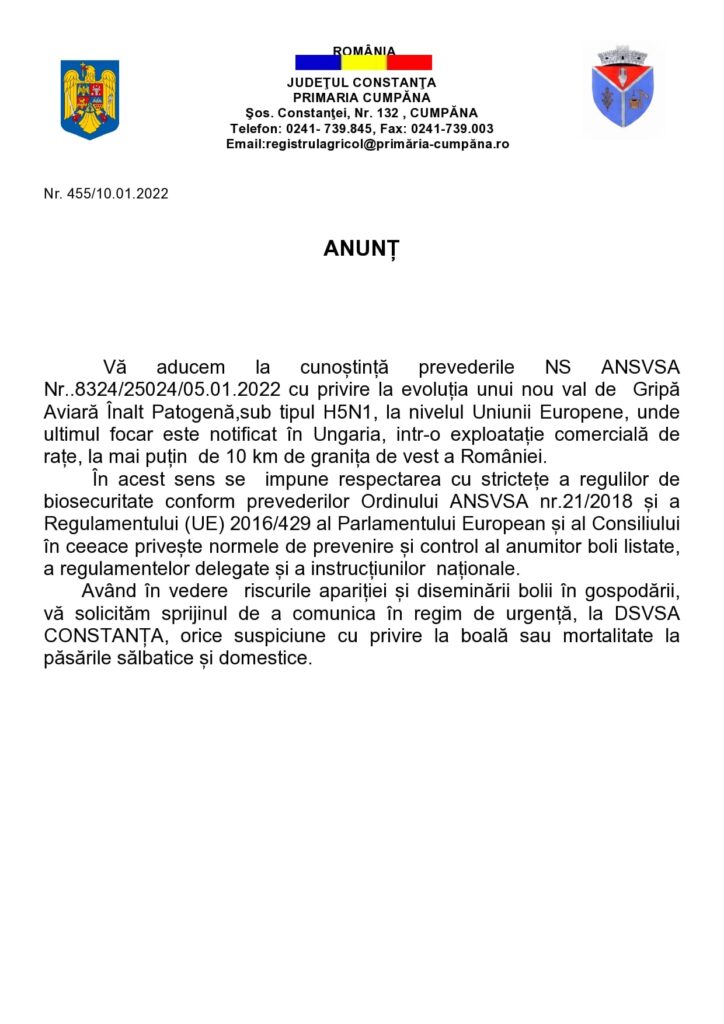 Vă aducem la cunoştinţă prevederile NS ANSVSA Nr..8324/25024/05.01.2022 cu privire la evoluţia unui nou val de Gripă Aviară Înalt Patogenă,sub tipul H5N1, la nivelul Uniunii Europene, unde ultimul focar este notificat în Ungaria, intr-o exploataţie comercială de raţe, la mai puţin de 10 km de graniţa de vest a României.