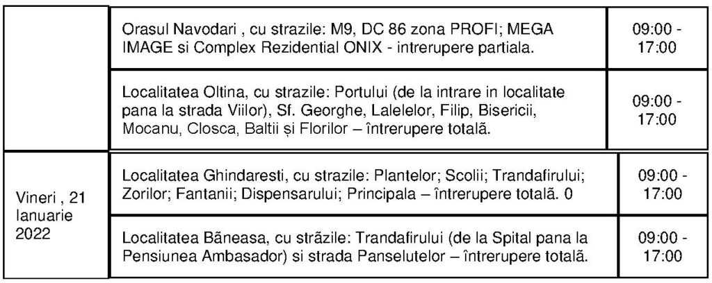 E-Distribuţie Dobrogea a redus pe cât posibil numărul întreruperilor programate pentru buna administrare și funcționare a rețelei de distribuție a energiei electrice, pentru a minimiza disconfortul clienților. Lucrările au fost reduse la cele care sunt necesare. Regretăm neplăcerile resimțite de clienți în cazurile în care aceste lucrări, efectuate pentru a preveni eventuale probleme în alimentare, perturbă temporar activitățile acestora.