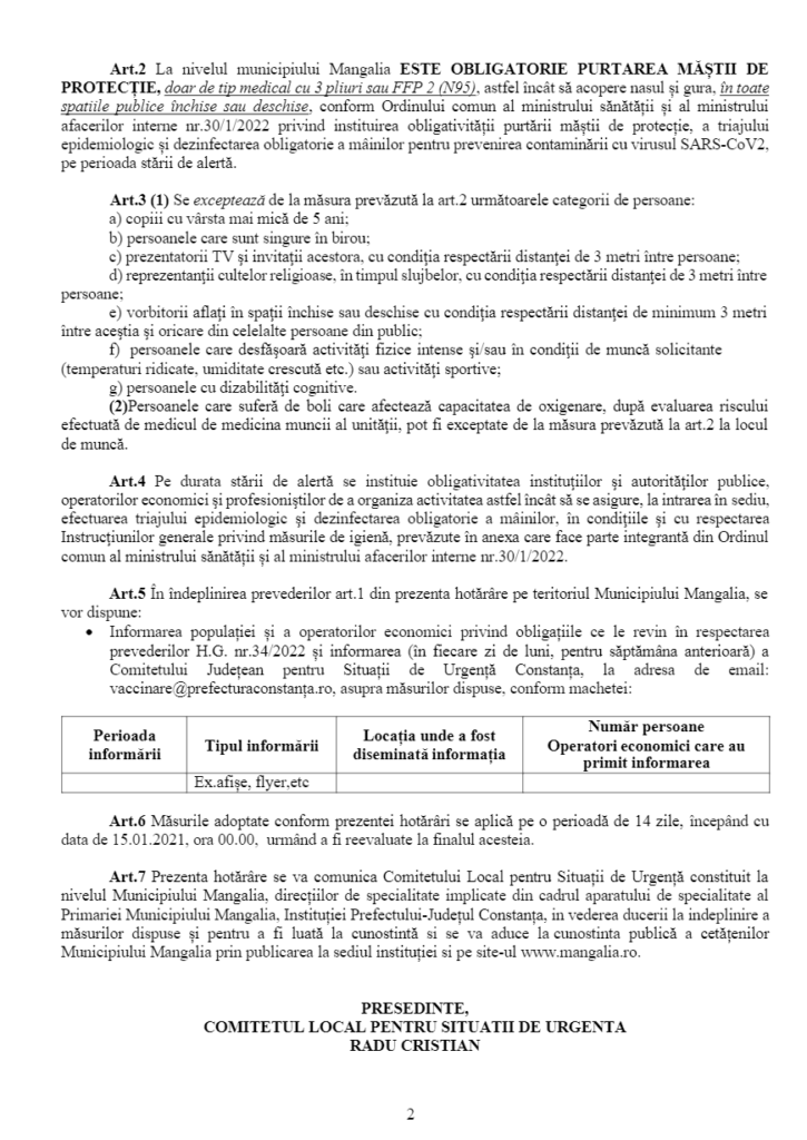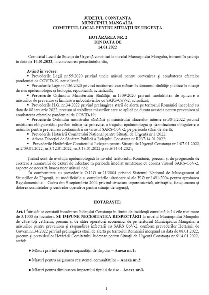 Hotararea nr.2 din 14.02.2022, adoptată de Comitetul Local pentru Situatii de Urgenta constituit la nivelul Municipiului Mangalia: