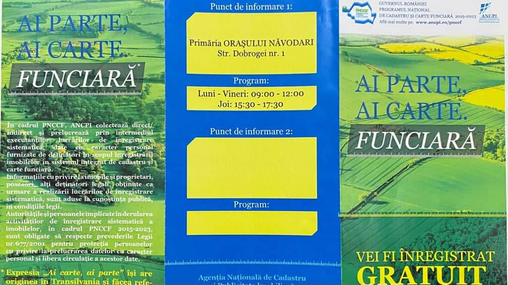 Primăria Năvodari invită proprietarii imobilelor din parcelele A56, A47, A41 din extravilanul orașului Năvodari să ridice de la sediul instituției documentele rezultatele în urma efectuării cadastrelor prin Programul Național de Cadastru și Carte Funciară.
