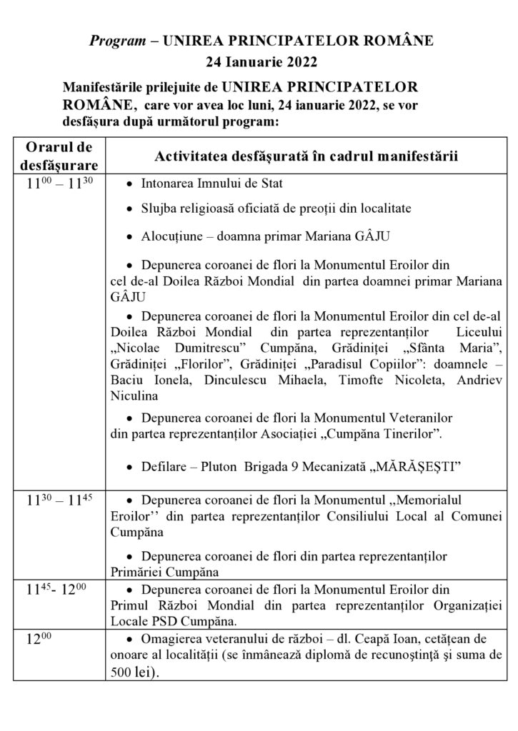 Programul manifestări de Ziua Unirii Principatelor Române, pe data de 24 ianuarie 2022, în comuna Cumpăna: