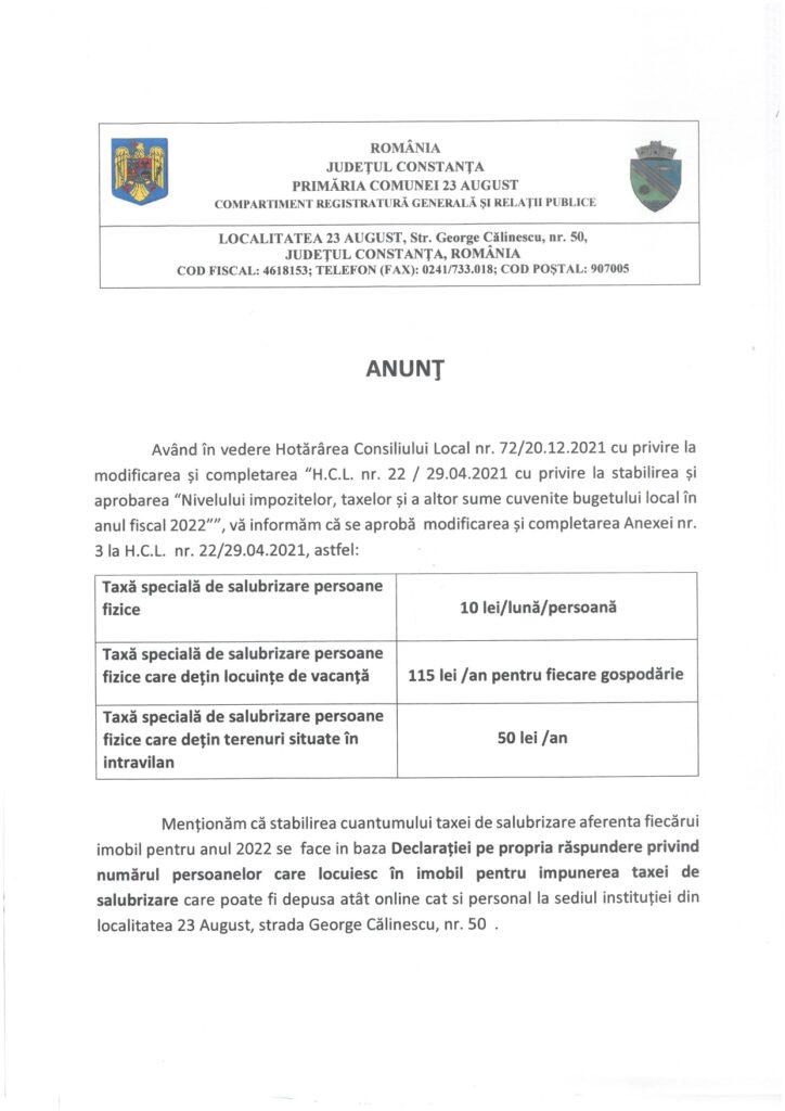 Având în vedere Hotărârea Consiliului Local nr. 72/20.12.2021 cu privire la modificarea și completarea “H.C.L. nr. 22 / 29.04.2021 cu privire la stabilirea și aprobarea “Nivelului impozitelor, taxelor şi a altor sume cuvenite bugetului local în anul fiscal 2022″”, vă informăm că se aprobă modificarea și completarea Anexei nr.
