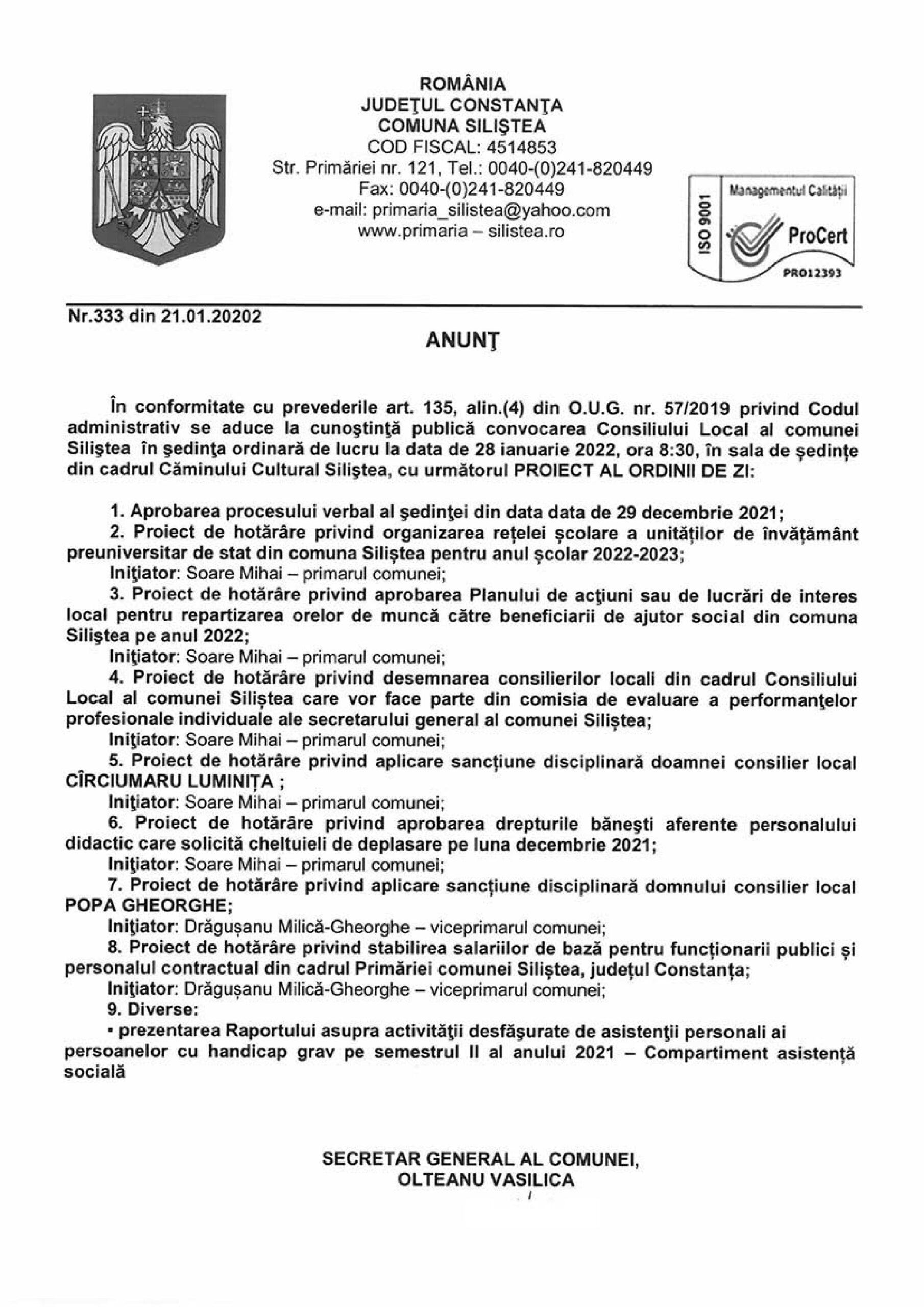 În conformitate cu prevederile art. 7 din Legea nr. 52/2003 privind transparența decizională în administrația publica, republicată, cu modificările și completările ulterioare, și ale prevederilor Regulamentului de Organizare și Funcționare al Consiliului Local, se aduce la cunoștință publică proiectul ordinii de zi a ședinței ordinare ce va avea loc în data de 28.01.2022, ora 08:30 în sala de ședințe din cadrul Căminului Cultural al com. Siliștea.