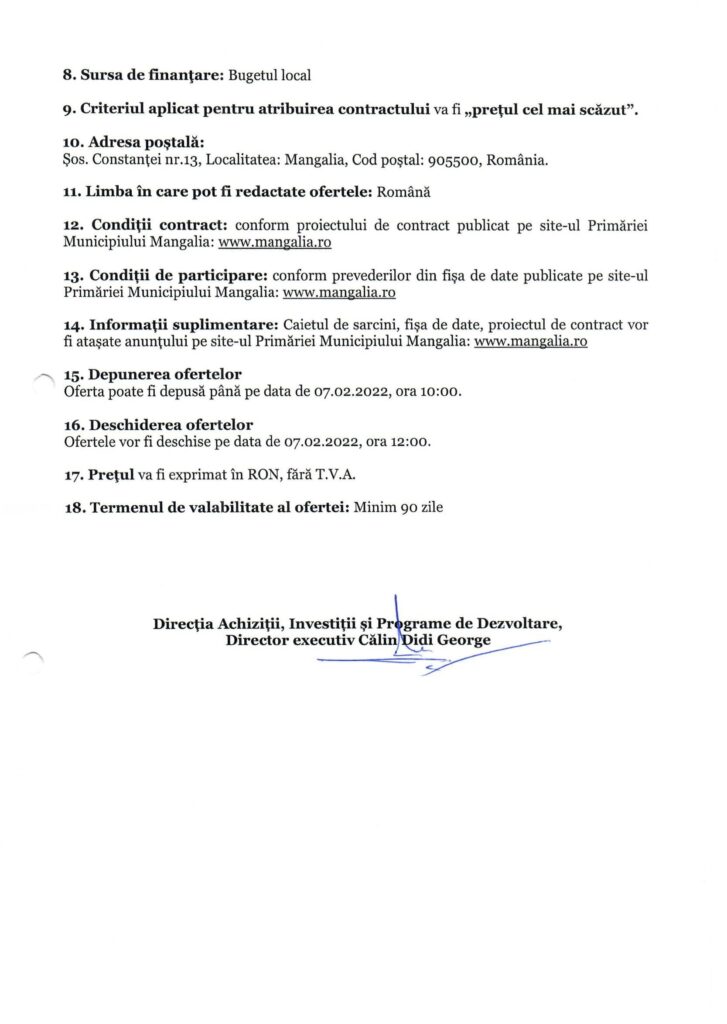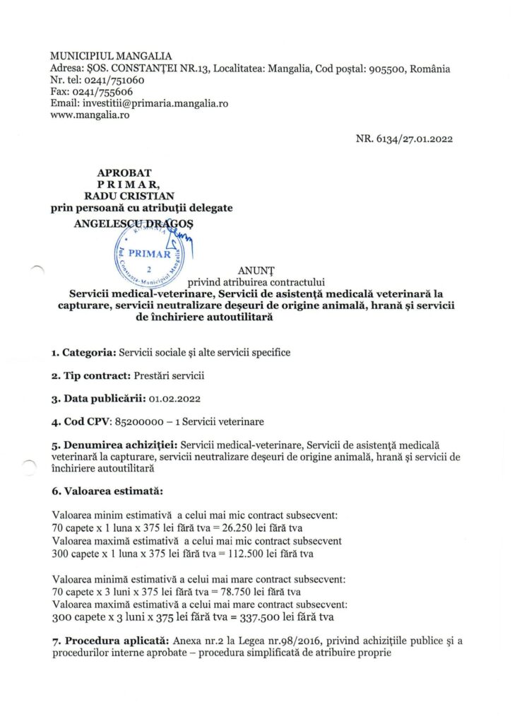 Anunt privind atribuirea contractului – Servicii medical-veterinare, Servicii de asistenta medicala veterinara la capturare, servicii neutralizare deseuri de origine animala, hrana si servicii de inchiriere autoutilitara