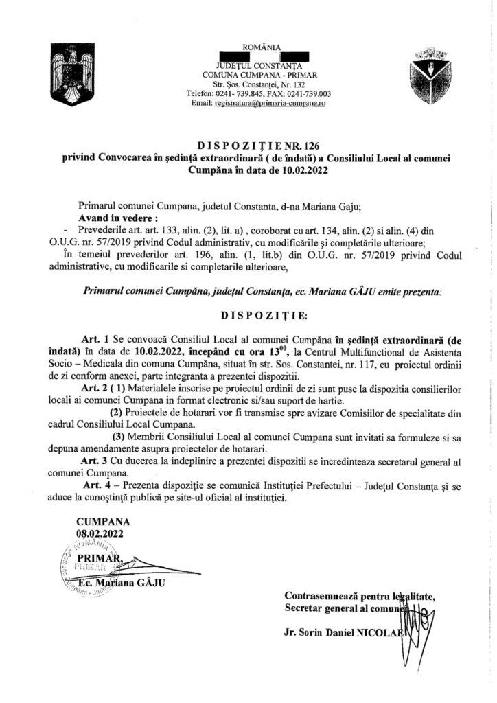 Primăria Cumpăna – Ședință extraordinară (de îndată) a Consilului Local al comunei Cumpăna în data de 10.02.2022, ora 13.00