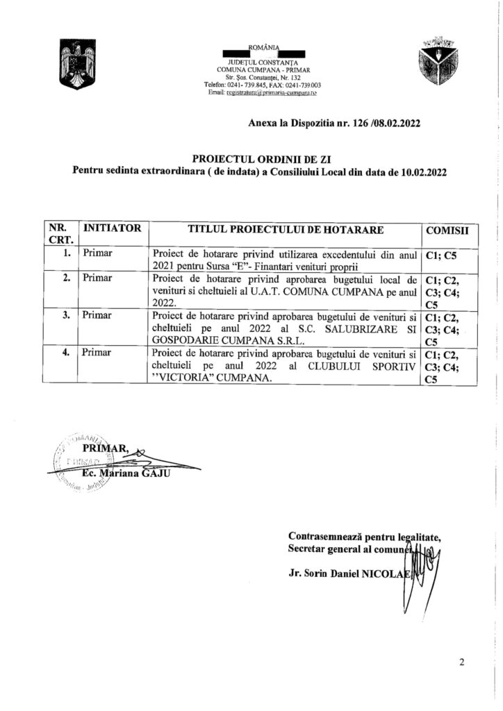 Ședință extraordinară (de îndată) a Consilului Local al comunei Cumpăna în data de 10. 02. 2022, ora 13.00