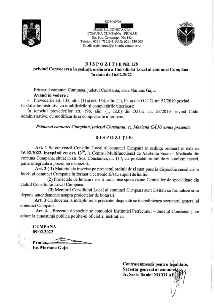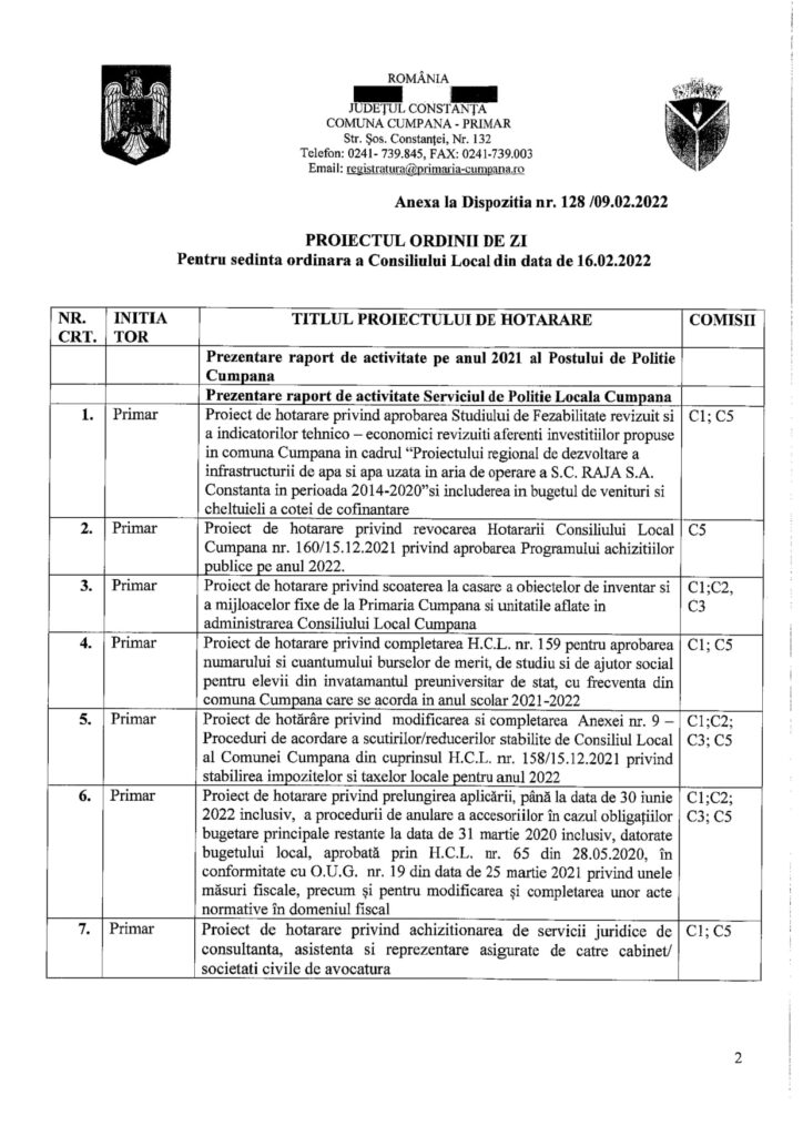 Primăria Cumpăna – Ședință ordinară a Consilului Local al comunei Cumpăna în data de 16. 02. 2022