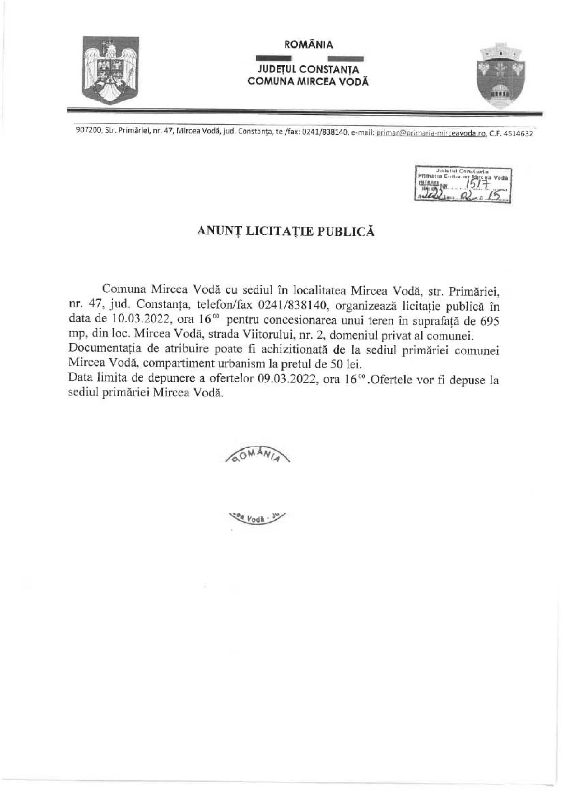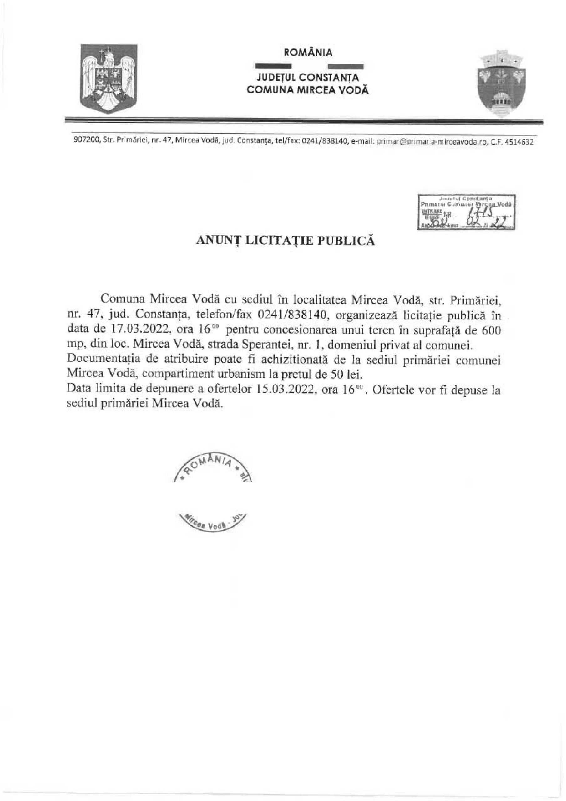 Primăria comunei Mircea Vodă organizează licitație publică în data de 17.03.2022, ora 16.00 pentru concesionarea unui teren aparținând domeniului privat.