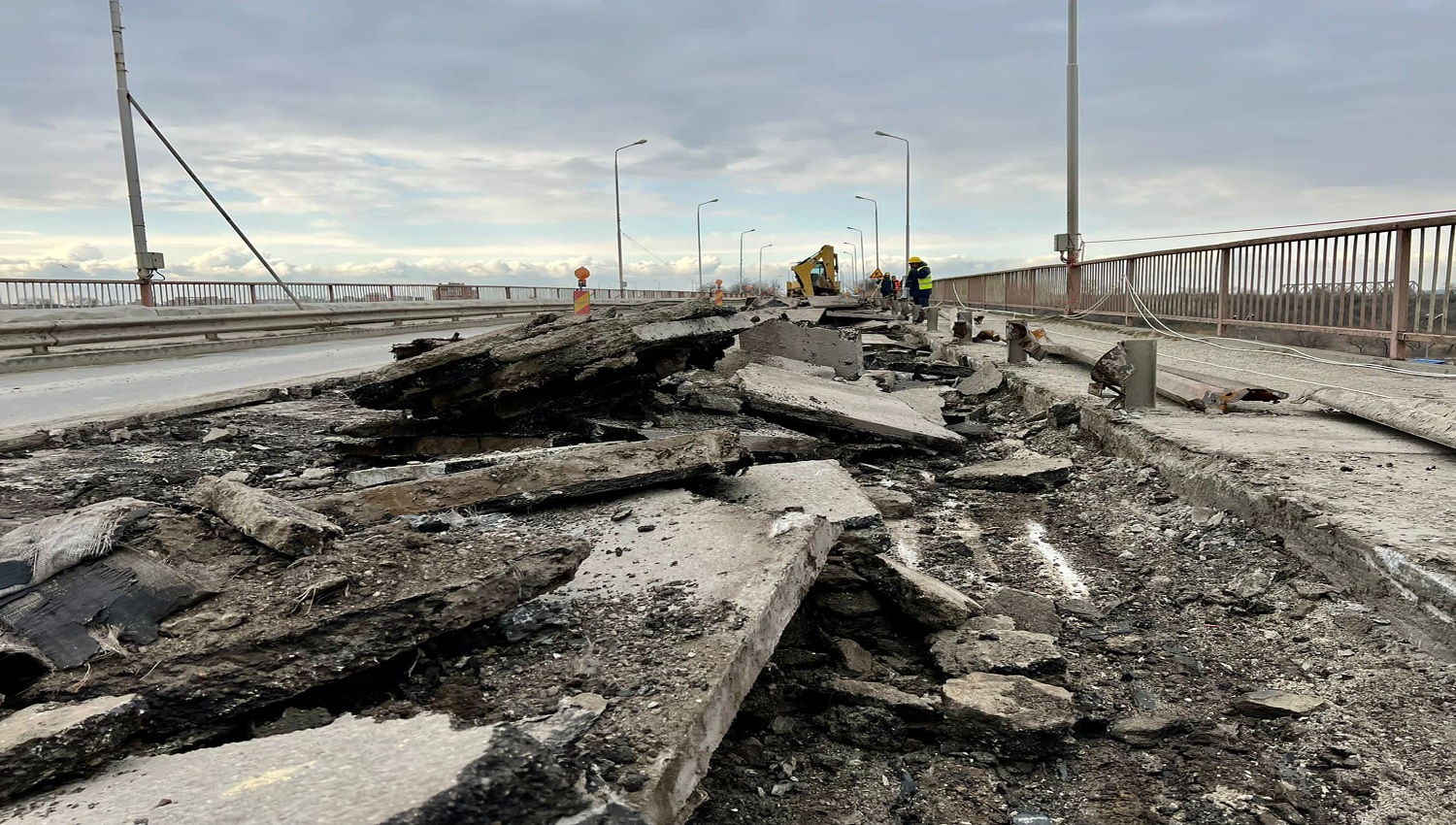 Lucrările se află în desfășurare fiind înlăturată îmbrăcămintea asfaltică pe sensul de mers către orașul Năvodari și trotuarul adiacent, parapetul rutier fiind demontat.;