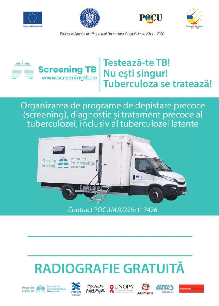 Institutul de Pneumoftiziologie ,,Marius Nasta” București derulează în cadrul proiectului ,,Organizarea de programe de depistare precoce(screening), diagnostic și tratament precoce al tuberculozei, inclusiv al tuberculozei latente”, activitate de screening a populației pentru depistare TBC