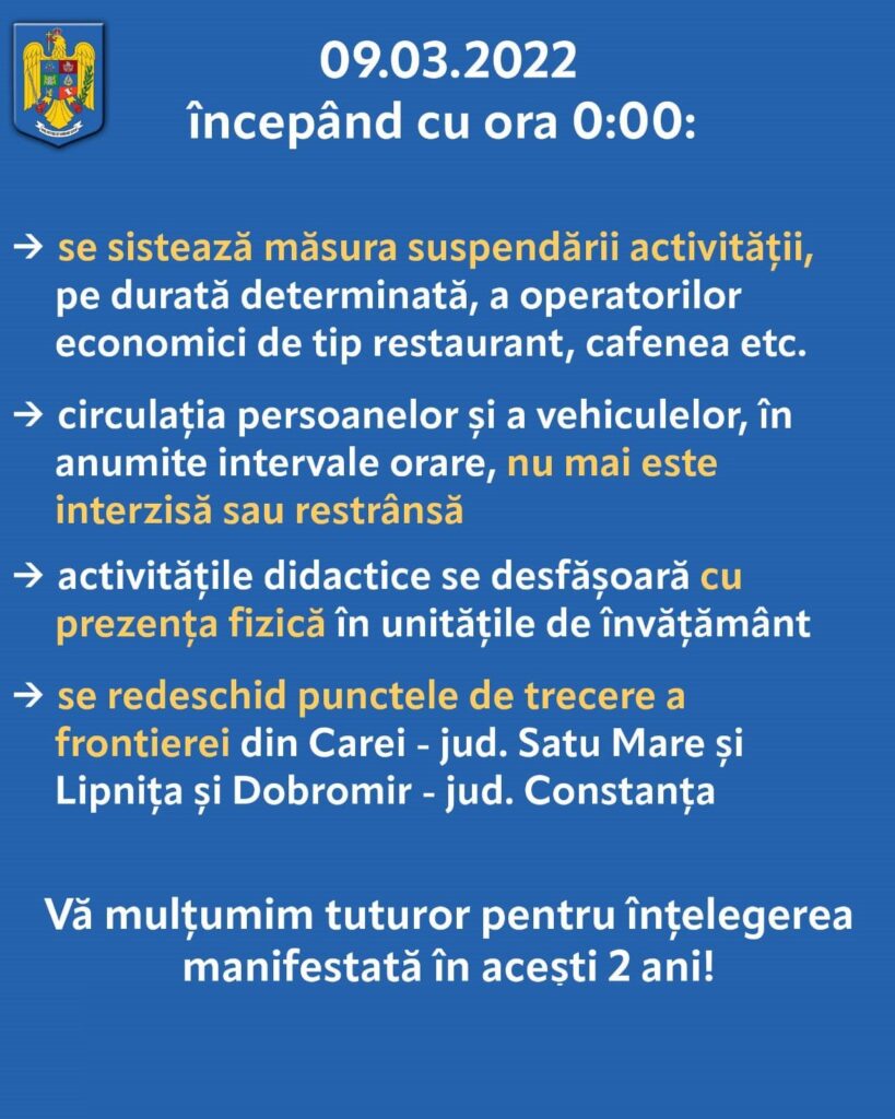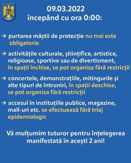 – Accesul în diverse spații publice (spații comerciale, magazine, instituții publice etc.) NU mai este limitat (NU se mai solicita certificat verde, testare).