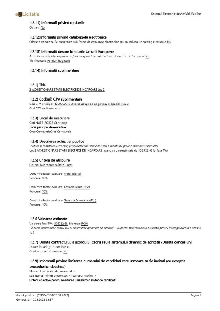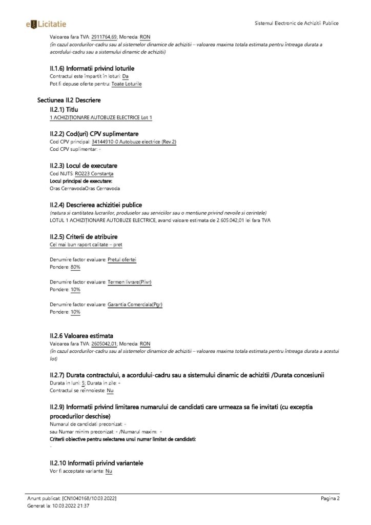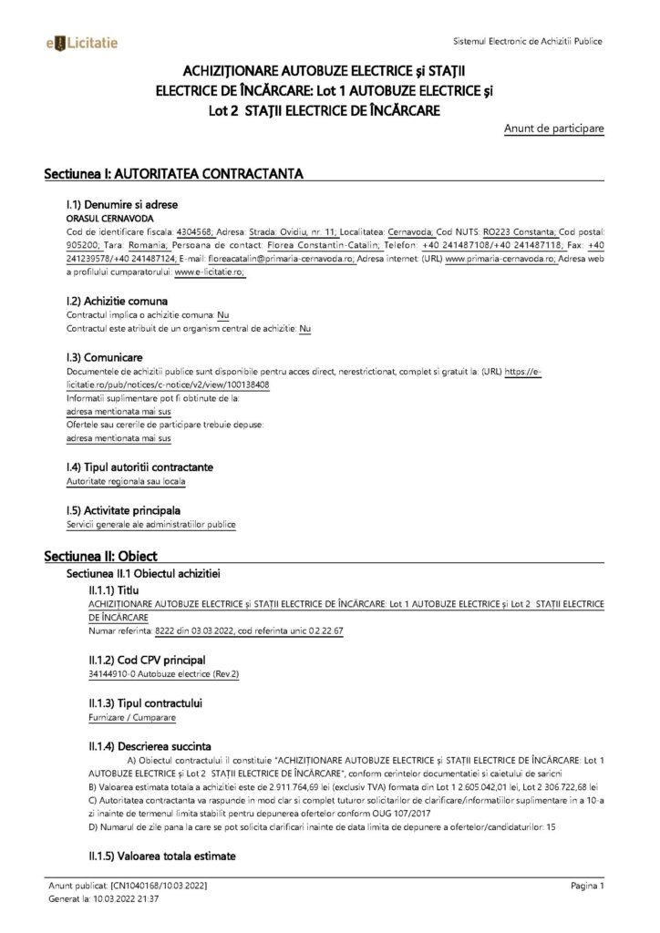 Primăria orașului Cernavodă (județul Constanța) organizează licitație pentru achiziționarea de autobuze electrice și stații de încărcare a acestora. Valoarea estimată a investiției este de aproximativ 3 milioane de lei, finanțarea fiind asigurată din fonduri bugetare. Termenul limită pentru depunerea ofertelor este 19 aprilie 2022.