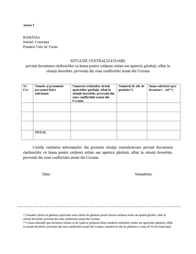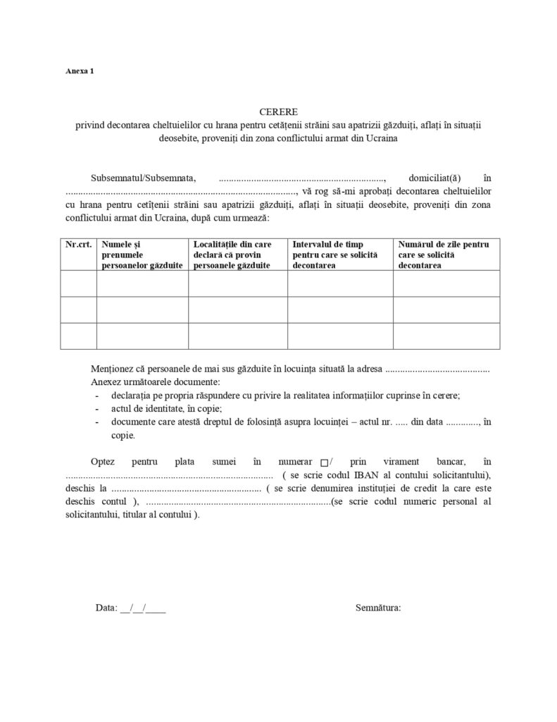 ✅cererea privind decontarea cheltuielilor cu hrana pentru cetățenii străini sau apatrizii găzduiți, aflați în situații deosebite, proveniți din zona confictului armat din Ucraina;