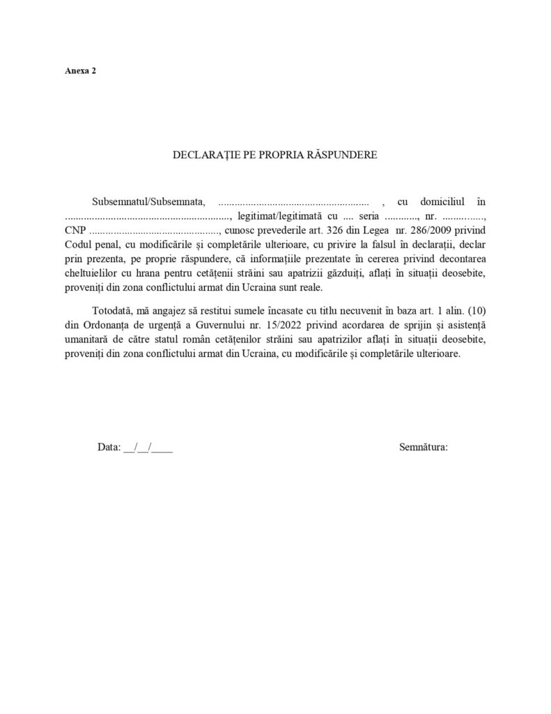 Acestea sunt conform modelelor anexate la Hotărârea de Guvern nr. 336, pentru persoanele fizice care găzduiesc cetățeni veniți din Ucraina.