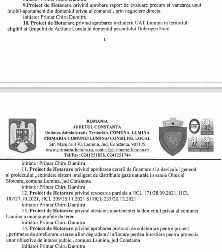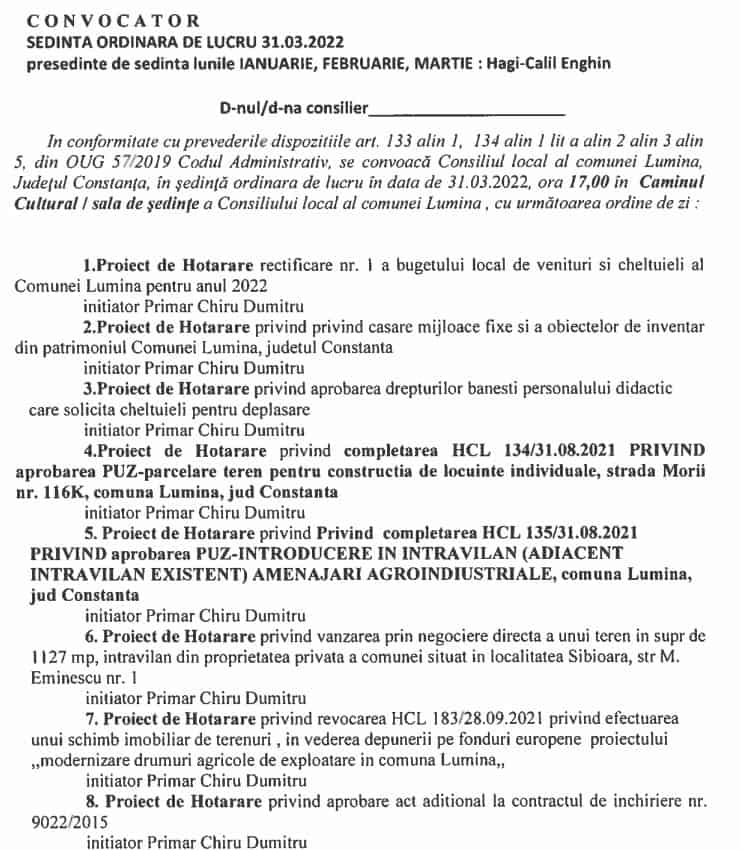 Primarul comunei Lumina, Dumitru Chiru, a convocat Consiliul Local al comunei în ședință ordinară, pentru data de 31.03.2022, de la ora 17.00, în Căminul Cultural. Pe ordinea de zi figurează 14 proiecte de hotărâre. Printre acestea se numără și cel referitor la aprobarea cererii de finanțare și a devizului general al proiectului „extindere sistem inteligent de gaze naturale în satele Oituz și Sibioara, comuna Lumina“.