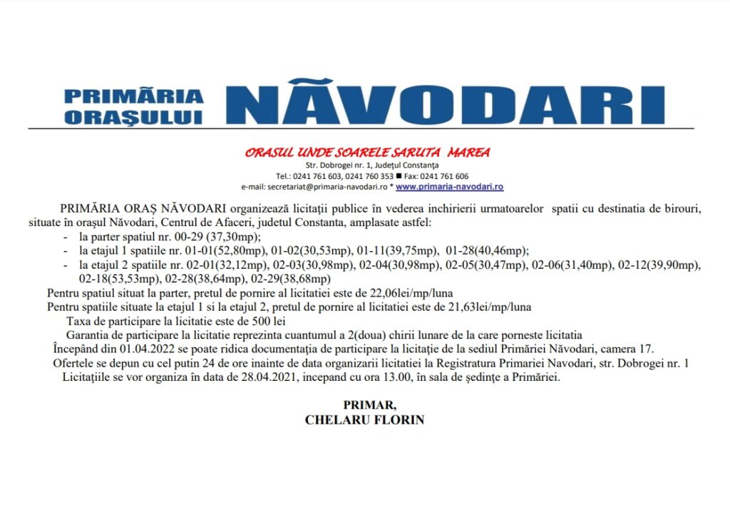 PRIMĂRIA NĂVODARI organizează licitaţii publice în vederea închirierii următoarelor spații cu destinația de birouri, situate în oraşul Năvodari, Centrul de Afaceri, județul Constanța