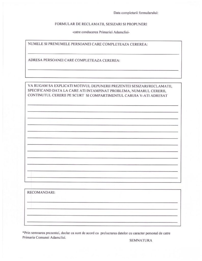 Primăria Adamclisi pune la dispoziția cetățenilor o cutie postala în care se pot depune reclamații și propuneri cu privire la activitatea personalului din Primărie, sesizări și propuneri cu privire la starea comunei Adamclisi sau alte propuneri. Modelul de formular se poate solicita la Biroul Secretarului General al unității adminsitrativ-teritoriale. În fiecare vineri a săptămânii, cutia va fi verificată iar formularele depuse vor fi înregistrate.