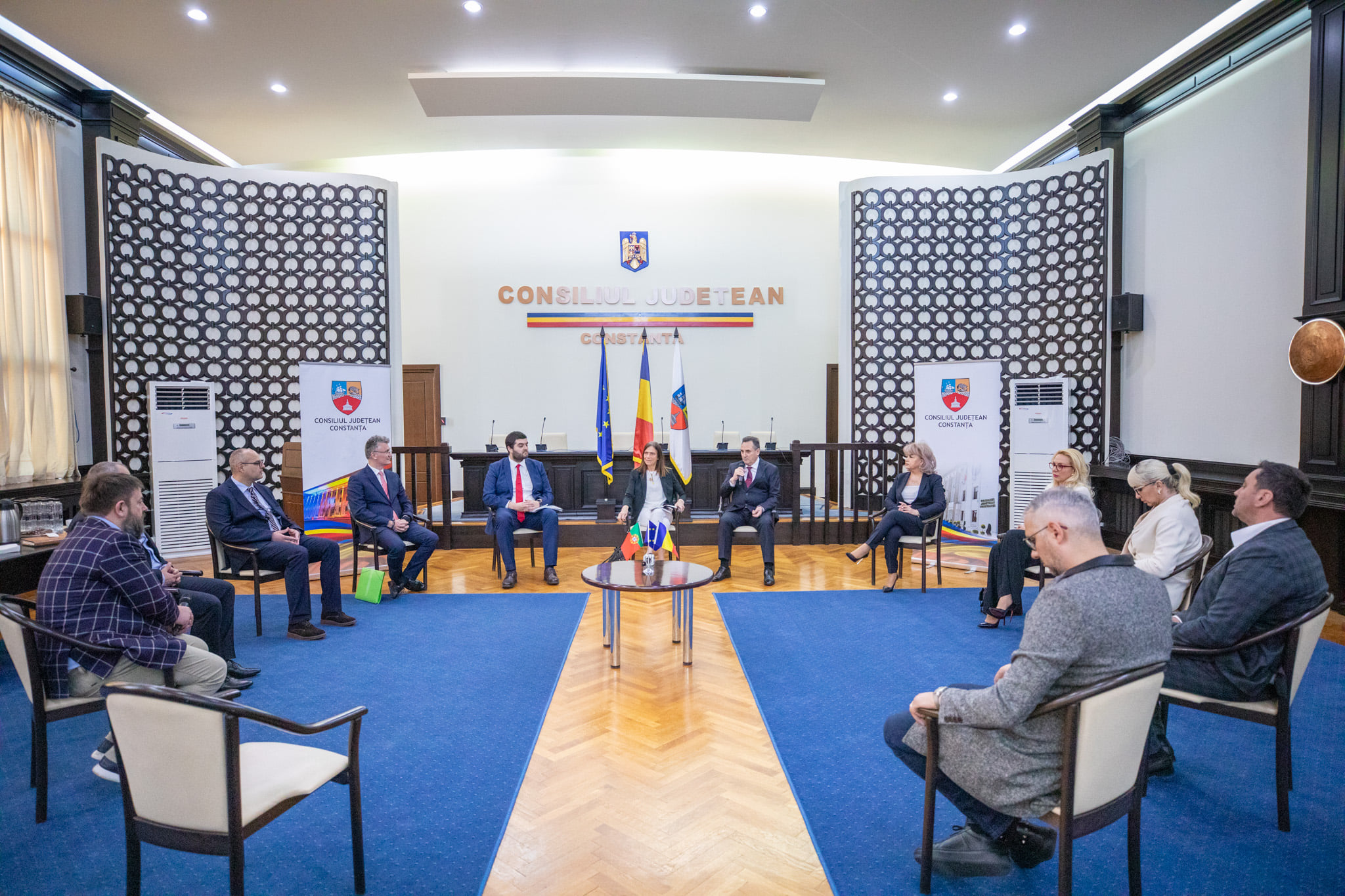 Președintele Consiliului Județean Constanța, Mihai Lupu, a primit astăzi vizita Excelenţei Sale Dna. Teresa Macedo, Ambasadorul Portugaliei în România şi a reprezentantului secţiei comerciale, domnul Helio Campos. La întâlnire au participat, alături de preşedintele CJC, preşedintele Asociaţiei de Dezvoltare Durabilă a Judeţului Constanţa, Ana-Maria Vătămanu, primarul comunei Mihail Kogălniceanu, Ancuţa Daniela Belu, preşedintele Bursei Române de Afaceri, Valentin Preda, directorul executiv al Direcţiei de Dezvoltare Judeţeană şi Coordonarea Instituţiilor de Sănătate, Sport şi Învăţământ din cadrul CJC, Oana Aurora Martin, precum și reprezentanți ai mediului de afaceri şi ai patronatelor din industria turismului constănţean. Vizita Excelentei Sale, face parte din Programul Internaţional City Diplomacy360, ce are ca obiectiv, promovarea proiectelor si oportunităţilor de dezvoltare economică, culturală, universitară, dar şi din alte sectoare reprezentative pentru Judetul Constanţa.