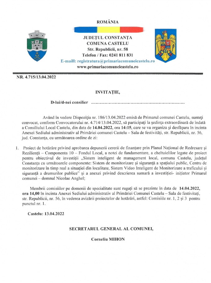 Consiliul Local al orașului Ovidiu cu sediul în orașul Ovidiu, str. Sănătății nr. 7, cod postal 905900, reprezentat legal prin Primar, Scupra George, cod fiscal 4301359, în baza HCL Ovidiu nr. 118/20.06.2023 și HCL...