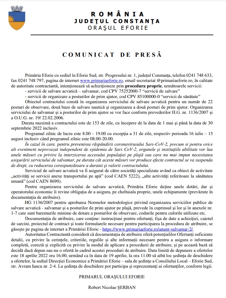 Primăria Eforie cu sediul în Eforie Sud, str. Progresului nr. 1, județul Constanţa, telefon 0241 748 633, fax 0241 748 797, pagina de internet www.primariaeforie.ro, email secretariat@primariaeforie.ro, în calitate de autoritate contractantă, intenționează să achiziționeze prin procedura proprie, următoarele servicii:
