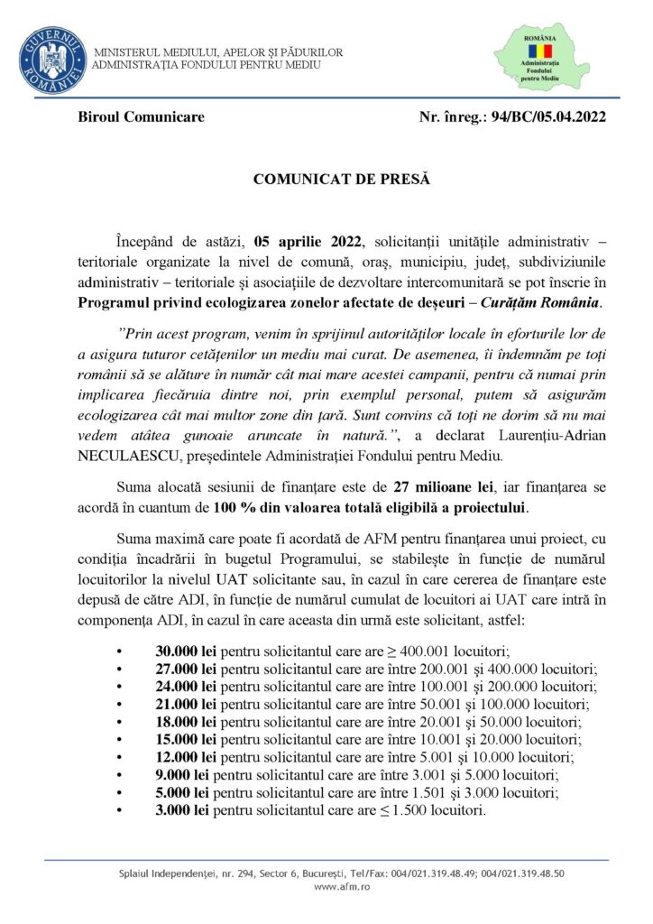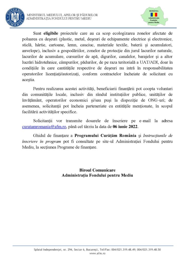Ministerul Mediului, Apelor și Pădurilor prin Administrația Fondului pentru Mediu desfașoară la nivel național campania ,,Curățăm România”. Pentru această campanie, AFM vine în ajutorul comunităților locale și cu fondurile necesare. Primăria Rasova a depus cererea de finanțare conform ghidului publicat de AFM.