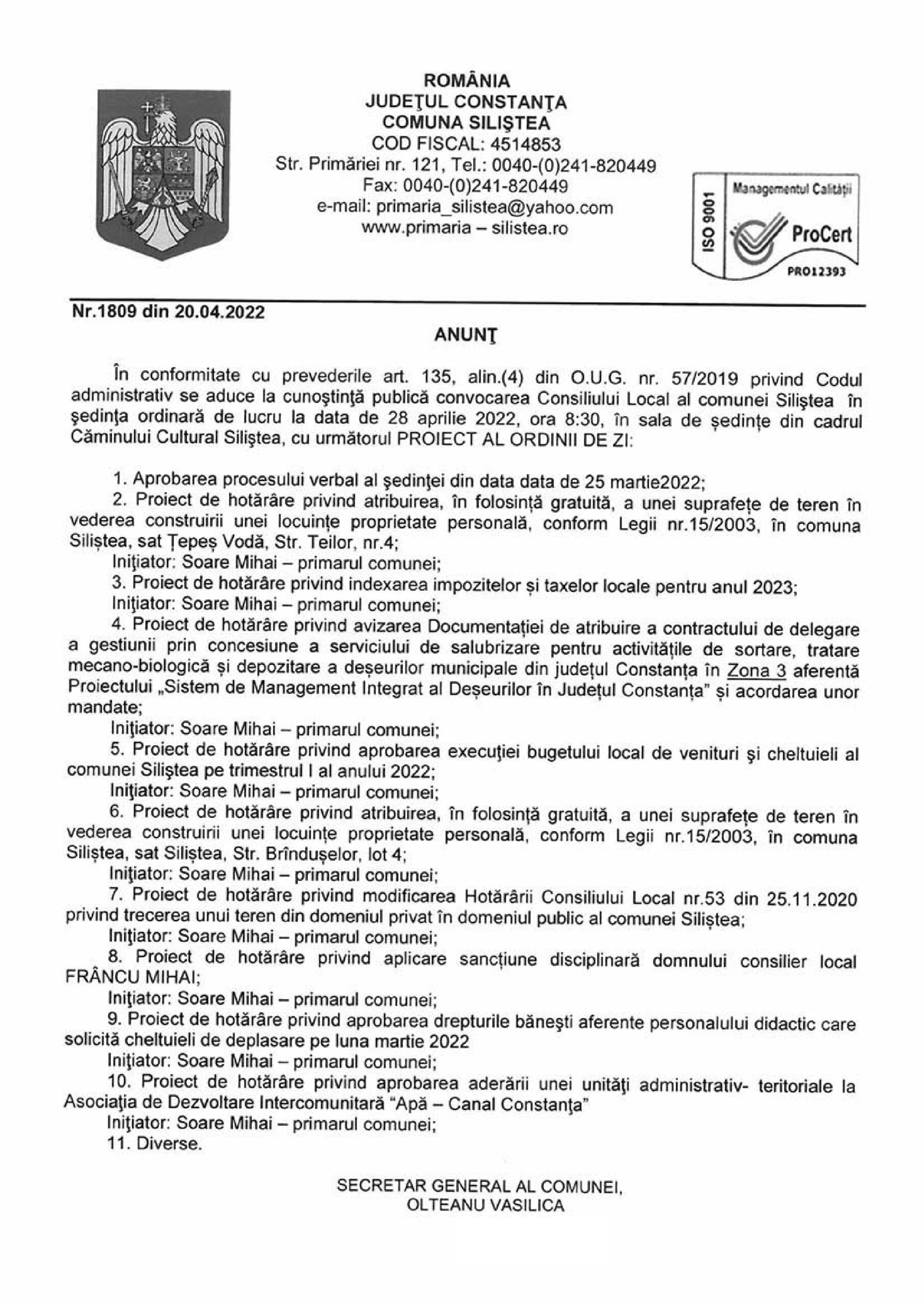 În conformitate cu prevederile art. 135, alin (4) din OUG 57/2019 privind Codul Administrativ și ale prevederilor Regulamentului de Organizare și Funcționare al Consiliului Local, se aduce la cunoștință publică convocarea Consiliului Local, în ședință ordinară de lucru, la data de 28.04.2022, ora 08:30, în sala de ședințe a Căminului Cultural Siliștea.