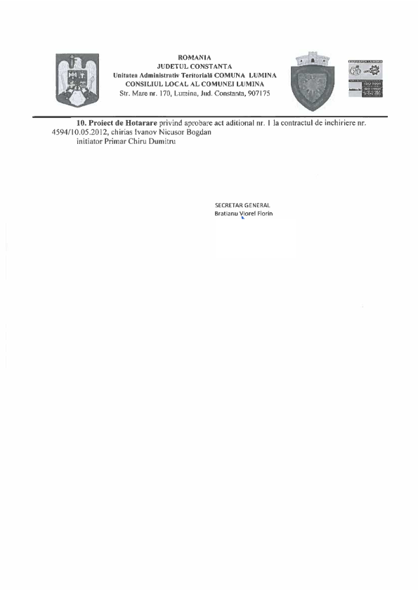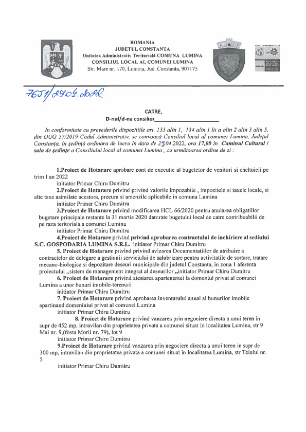 In conformitate cu prevederile dispozitiile art. 133 alin. 1 lit a, art 134 alin 1 lit a, alin 3 lit a , alin 5 , art. 196 alin 1 lit b din O.U.G. 57/2019, Cod Administrativ prin Dispozitia Primarului Comunei Lumina se convoacă Consiliul local al comunei Lumina, Judeţul Constanţa, în şedinţă ordinara în data de 29.04.2022 , ora 17,00 în Caminul Cultural / sala de şedinţe a Consiliului local al comunei Lumina.