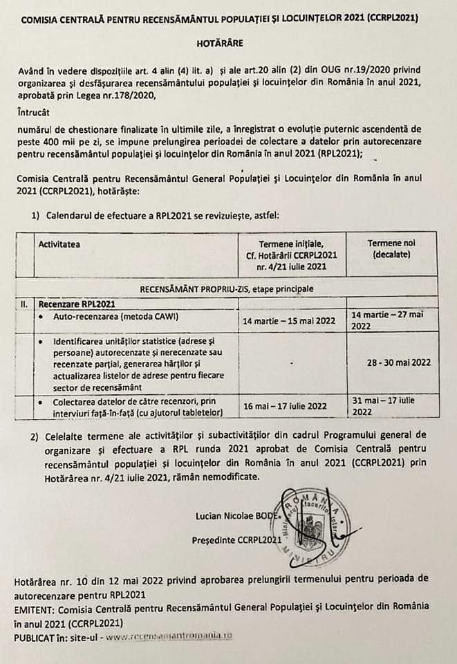 Având ìn vedere Hotărârea nr. 10 din 12.05.2022 emisă de Comisia Centrală pentru Recensământul General al Populației și Locuințelor din România, vă anunțăm faptul că s-a stabilit prelungirea perioadei de autorecenzare și autorecenzare asistată până la data de 27 mai 2022.