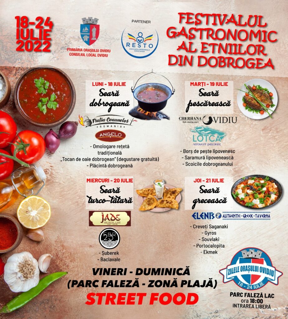 ✅🫕18 – 21 iulie: Festival gastronomic al etniilor din Dobrogea, în parteneriat cu Asociația Patronală RESTO (zilnic, începând cu ora 18:00, degustări gratuite; omologăm rețete autentice în cel mai mare ceaun din România – 2 tone, seară dobrogeană, seară pescărească, seară turco-tătară, seară grecească și alte suprize, locație Parc Zonă Relaxare – plajă)