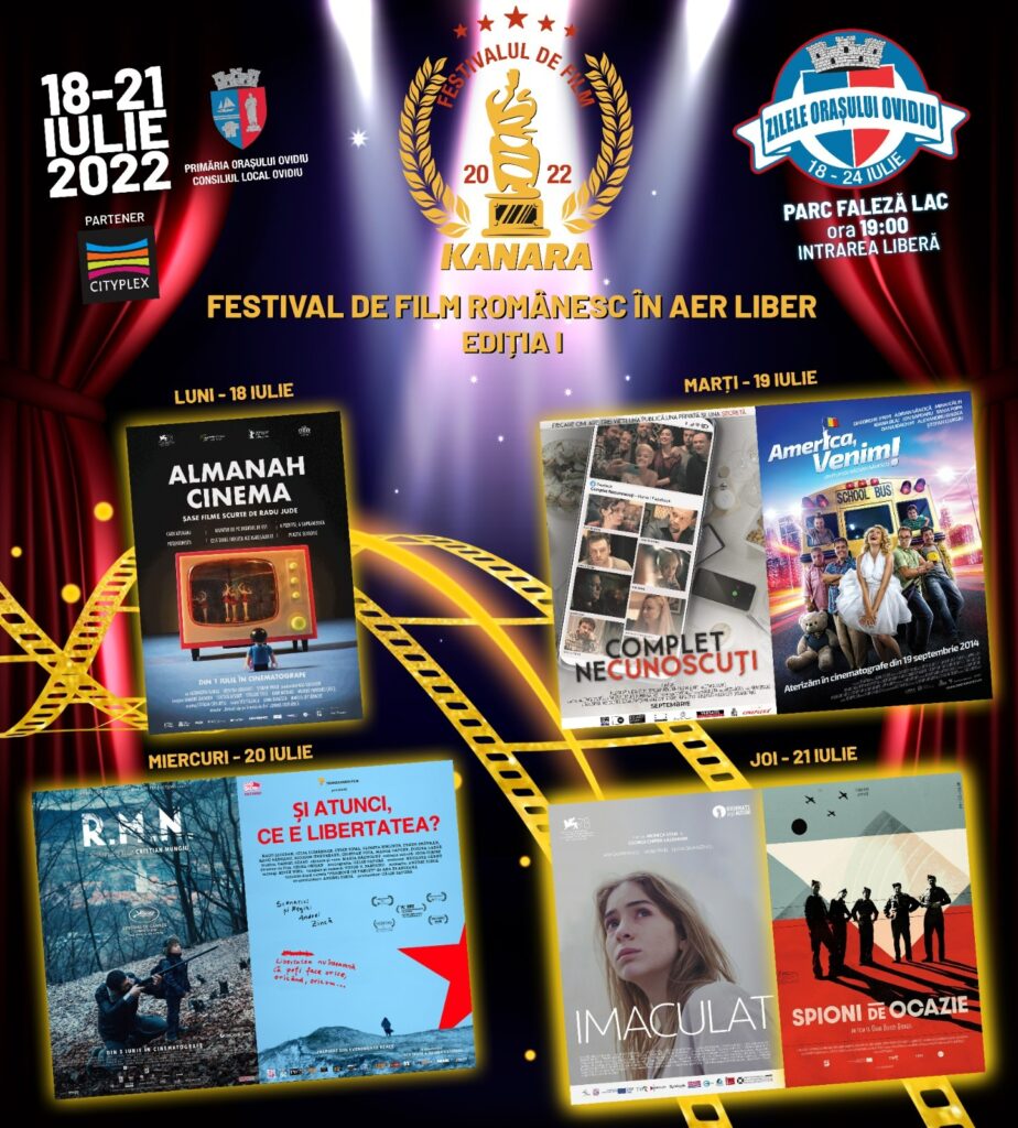 🔜 În perioada 18 – 21 iulie, primăria Ovidiu, organizează Festivalul filmului românesc ,,KANARA’’, ediția I ( zilnic începând cu ora 19:00, 2 proiecții de filme, premiate la festivalurile internaționale, locație Parc Faleză Lac – scenă lac).