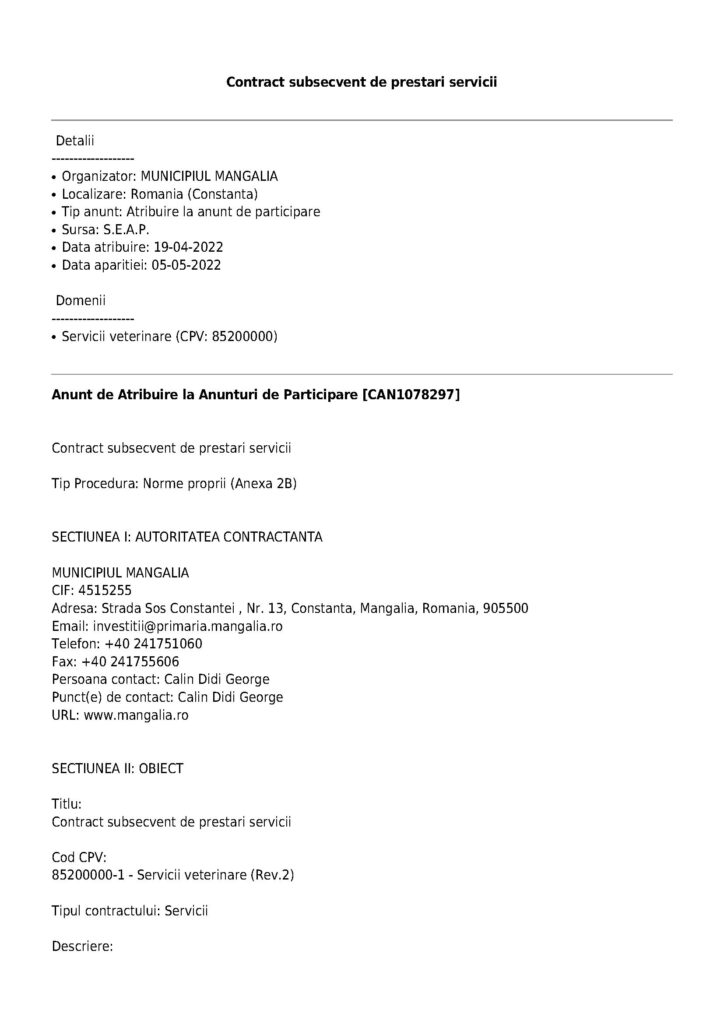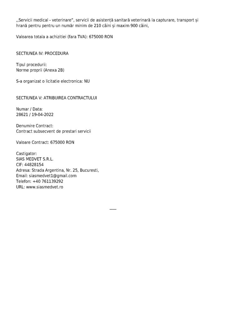 Potrivit Licitația Publica.ro contractual prevede „Servicii medical – veterinare”, servicii de asistență sanitară veterinară la capturare, transport și hrană pentru pentru un număr minim de 210 câini și maxim 900 câini.