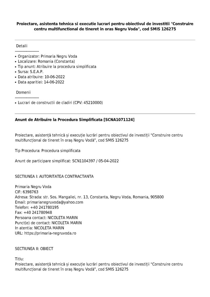 Contractul vizează proiectarea și execuția lucrărilor pentru obiectivul de investiții „Construire centru multifuncțional de tineret în oraș Negru Vodă“ și constau în :