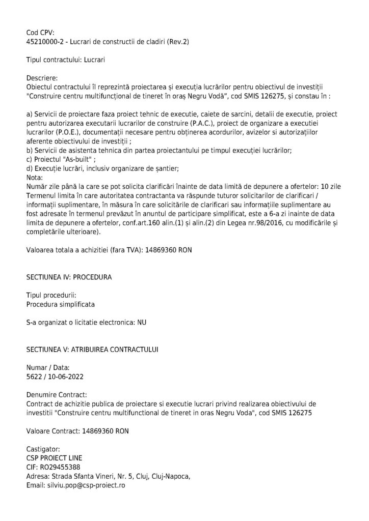 Potrivit datelor oficiale, compania care a semnat contractul cu Primăria Negru Vodă este CSP Proiect Line din Cluj, atribuirea făcându-se prin procedura simplificată.