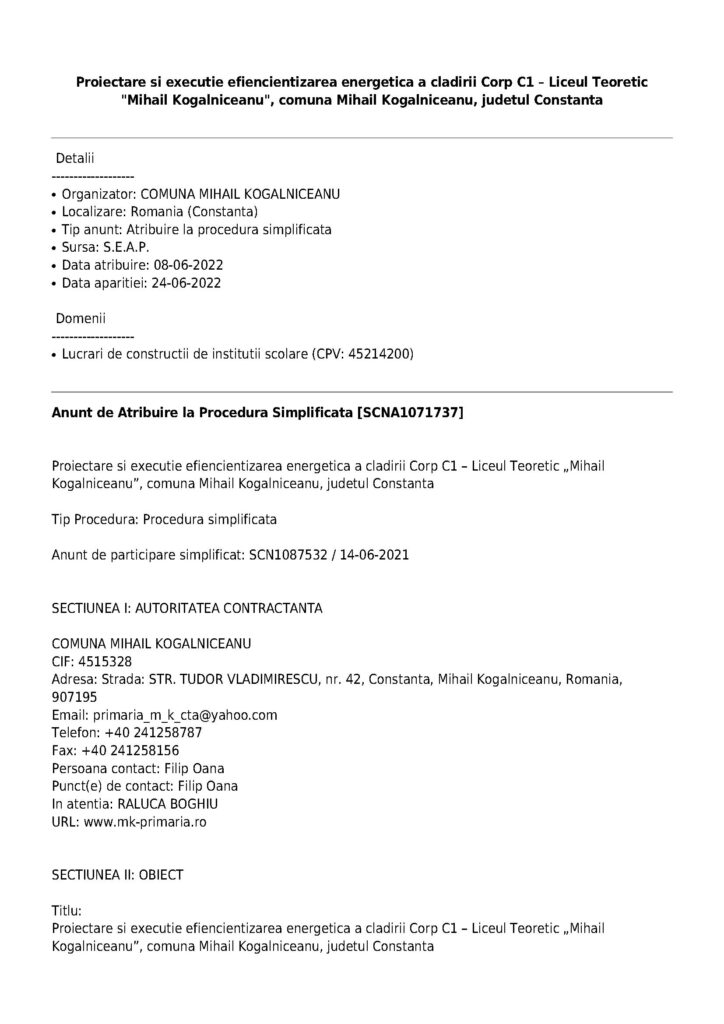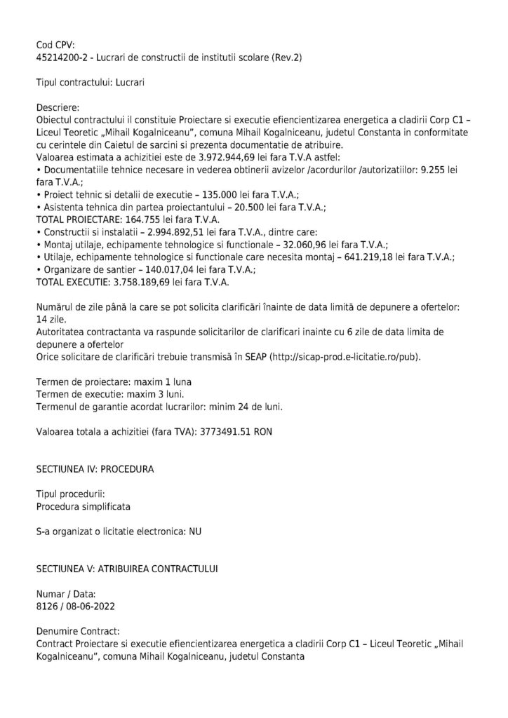 Atribuirea a avut loc pe 8 iunie 2022, iar rezultatul final a fost afișat, conform licitatiapublica.ro, la data de 24 iunie. Obiectul contractului il constituie Proiectare si executie efiencientizarea energetica a cladirii Corp C1 – Liceul Teoretic „Mihail Kogalniceanu”, comuna Mihail Kogalniceanu, judetul Constanta in conformitate cu cerintele din Caietul de sarcini.