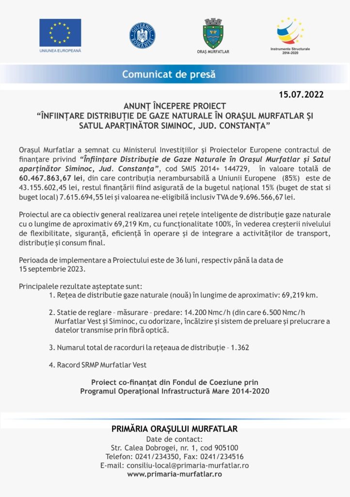 Orașul Murfatlar a semnat cu Ministerul Investițiilor și Proiectelor Europene contractul de finanțare privind “Înființare Distribuție de Gaze Naturale în Orașul Murfatlar și Satul aparținător Siminoc, Jud. Constanța”, cod SMIS 2014+ 144729, în valoare totală de 60.467.863,67 lei, din care contribuția nerambursabilă a Uniunii Europene (85%) este de 43.155.602,45 lei, restul finanțării fiind asigurată de la bugetul național 15% (buget de stat si buget local) 7.615.694,55 lei și valoarea ne-eligibilă inclusiv TVA de 9.696.566,67 lei.
