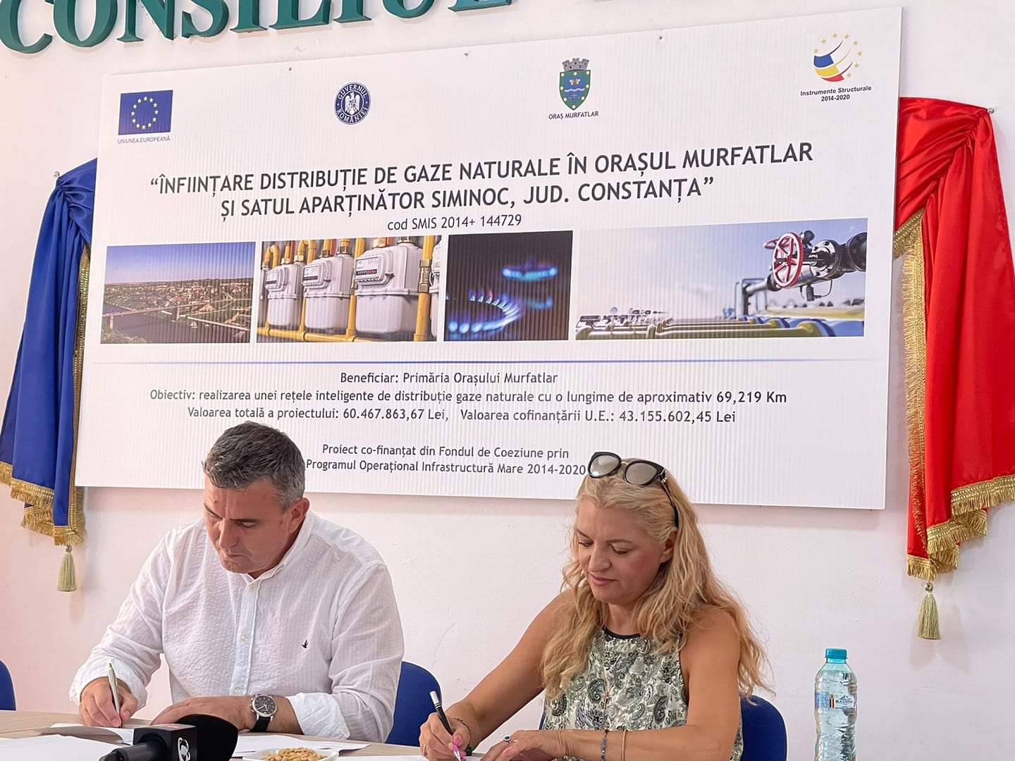 Astăzi, 29.07.2022 autoritățile din Murfatlar au semnat Contractul de Proiectare și Execuție Lucrări din cadrul proiectului “Înființare distribuție de gaze naturale în orașul Murfatlar și satul aparținător Siminoc, jud. Constanța”, proiect co-finanțat din Fondul de Coeziune prin Programul Operațional Infrastructură Mare 2014-2020, între Primăria orașului Murfatlar, reprezentată de primar și Asocierea S.C. Bedamiro Holding Parcari Construct S.A. (Lider) – S.C. Nord Gaz S.R.L. – S.C. Aqua Tehnology Design S.R.L. – S.C. Otto Gaz & Services S.R.L.