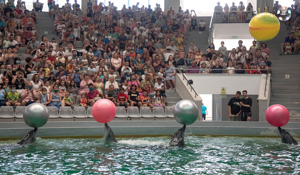 Cei șase delfini din cadrul Complexului Muzeal de Științe ale Naturii din Constanța așteaptă, ca de fiecare dată, publicul larg pentru a se bucura de spectacolele pe care le-au pregătit împreună cu antrenorii. Jocuri cu mingii, salturi, dans, moment de pictură și multă voie bună.