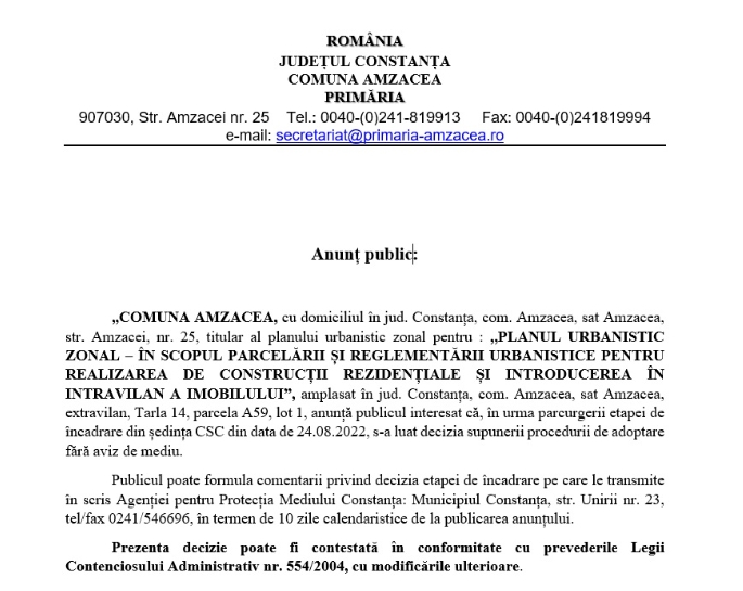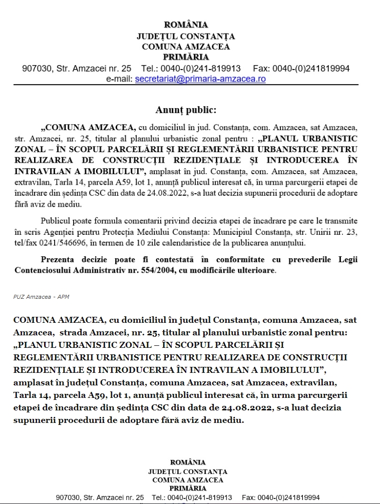Primăria Amzacea – Informare privind „PLANUL URBANISTIC ZONAL – ÎN SCOPUL PARCELĂRII ȘI REGLEMENTĂRII URBANISTICE PENTRU REALIZAREA DE CONSTRUCȚII REZIDENȚIALE ȘI INTRODUCEREA ÎN INTRAVILAN A IMOBILULUI”