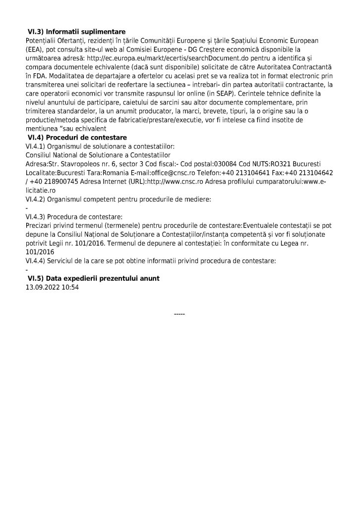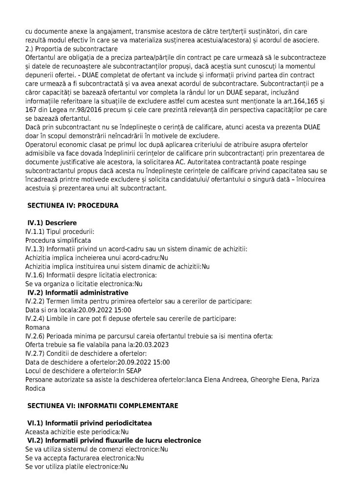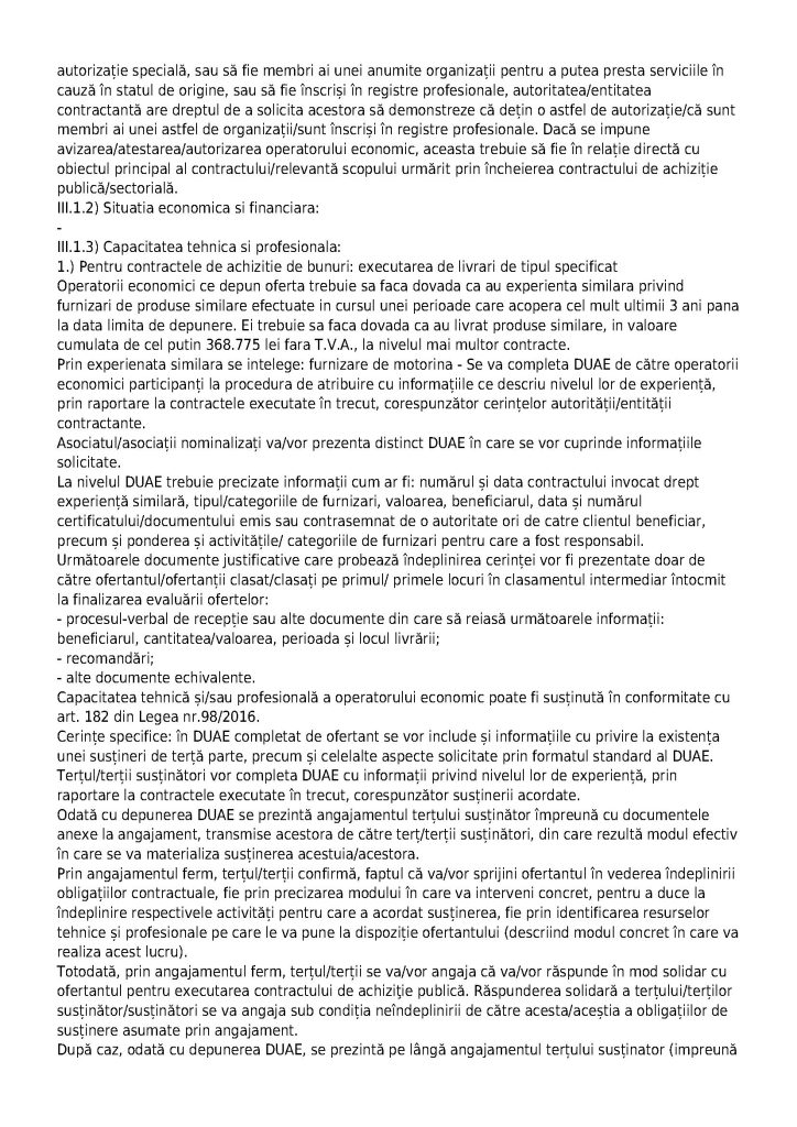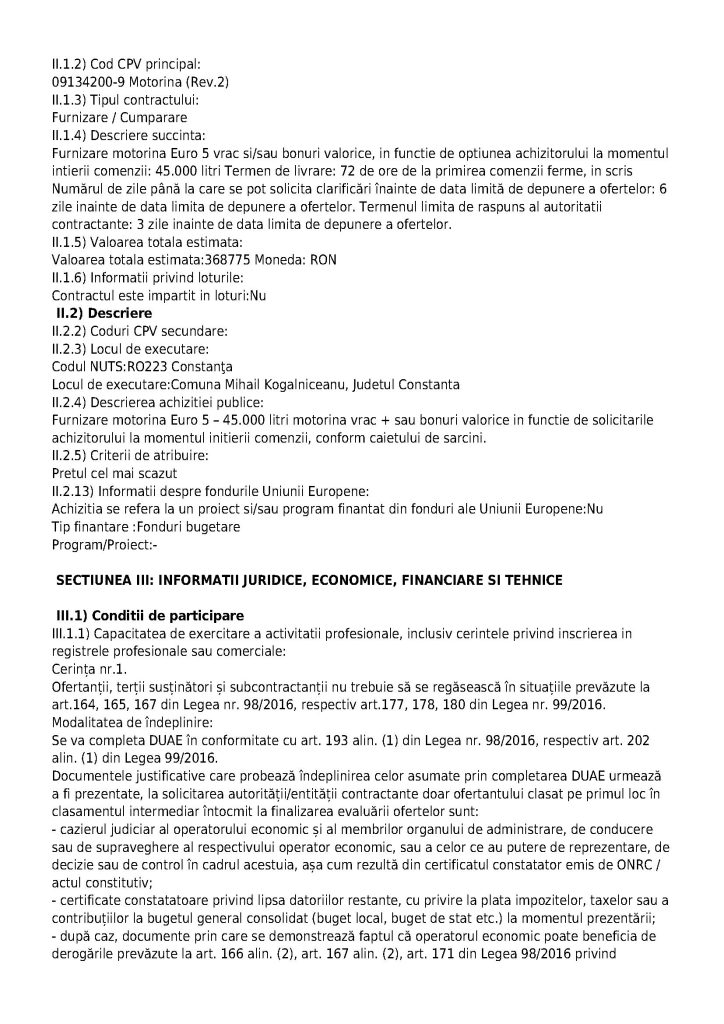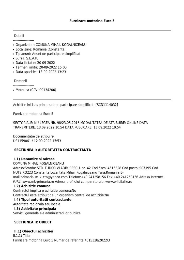 Valoarea estimată este de 368.775 lei, iar termenul limită pentru depunerea ofertelor este 20 septembrie 2022. Este vorba de furnizare motorină Euro 5 vrac și/sau bonuri valorice, în funcție de opțiunea achizitorului la momentul inițierii comenzii – 45.000 litri.