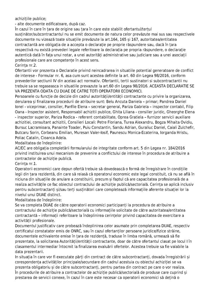 Persoanele cu funcție de decizie din cadrul autorității/entității contractante cu privire la organizarea, derularea și finalizarea procedurii de atribuire sunt: Belu Ancuța Daniela – primar; Pandrea Daniel Ionel – viceprimar, consilier, Panfile Elena – secretar general, Pariza Gabriela – inspector contabil, Filip Oana – Inspector asistent, Responsabil achiziții publice, Ghiță Liliana – consilier juridic, Gheorghe Elena – inspector superior, Pariza Rodica – referent contabilitate, Oprea Grațiela – furnizor servicii auxiliare achiziției, consultant achiziții, Consilieri Locali: Petre Floriana, Turea Alexandru, Bogza Mihăiță Ovidiu, Bursuc Lăcrămioara, Panainte Toader, Puiu Constantin, Sandu Adrian, Guraliuc Daniel, Caiali Zulchefir, Butcaru Sorin, Corbeanu Emilian, Muresan Valer-Iosif, Păunescu Monica-Ecaterina, Iorganda Hristu, Poliac Cătălin, Cioancă Adela.