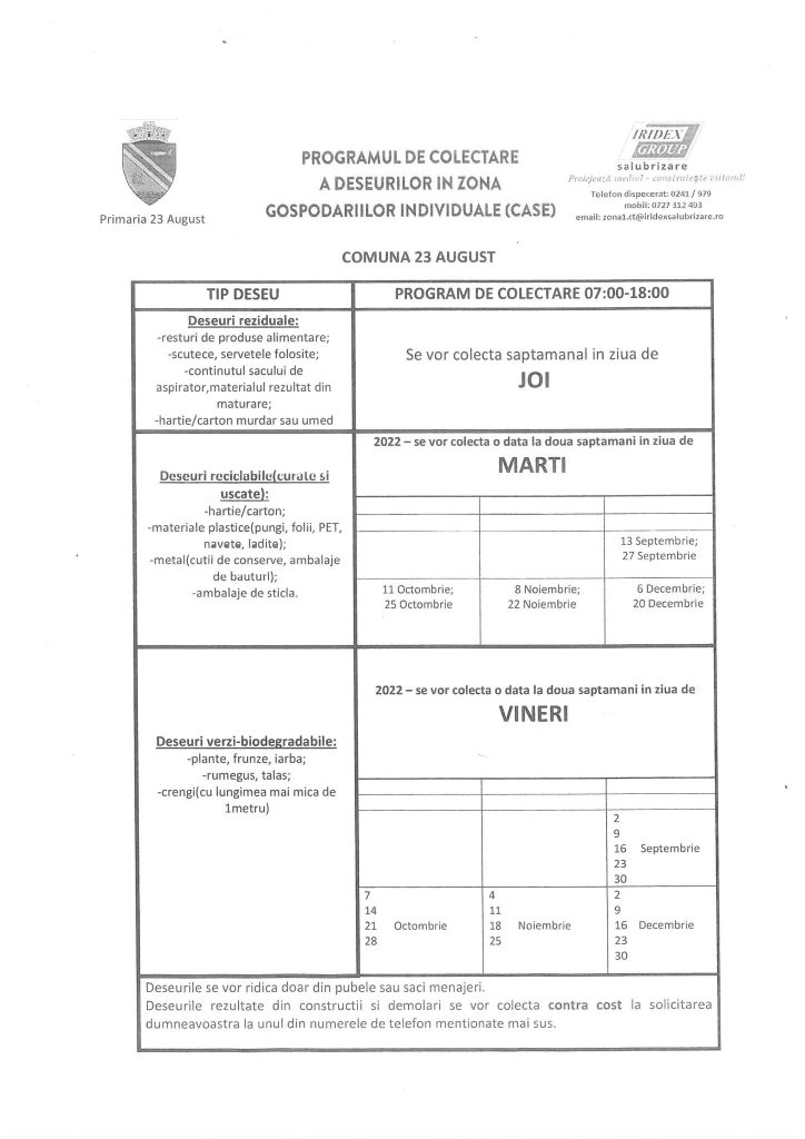 Începând cu data de 15.09.2022 în localitatea 23 August, colectarea deşeurilor reziduale, reciclabile şi verzi-biodegradabile se vor face conform programului afişat