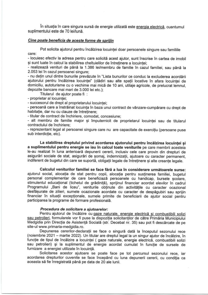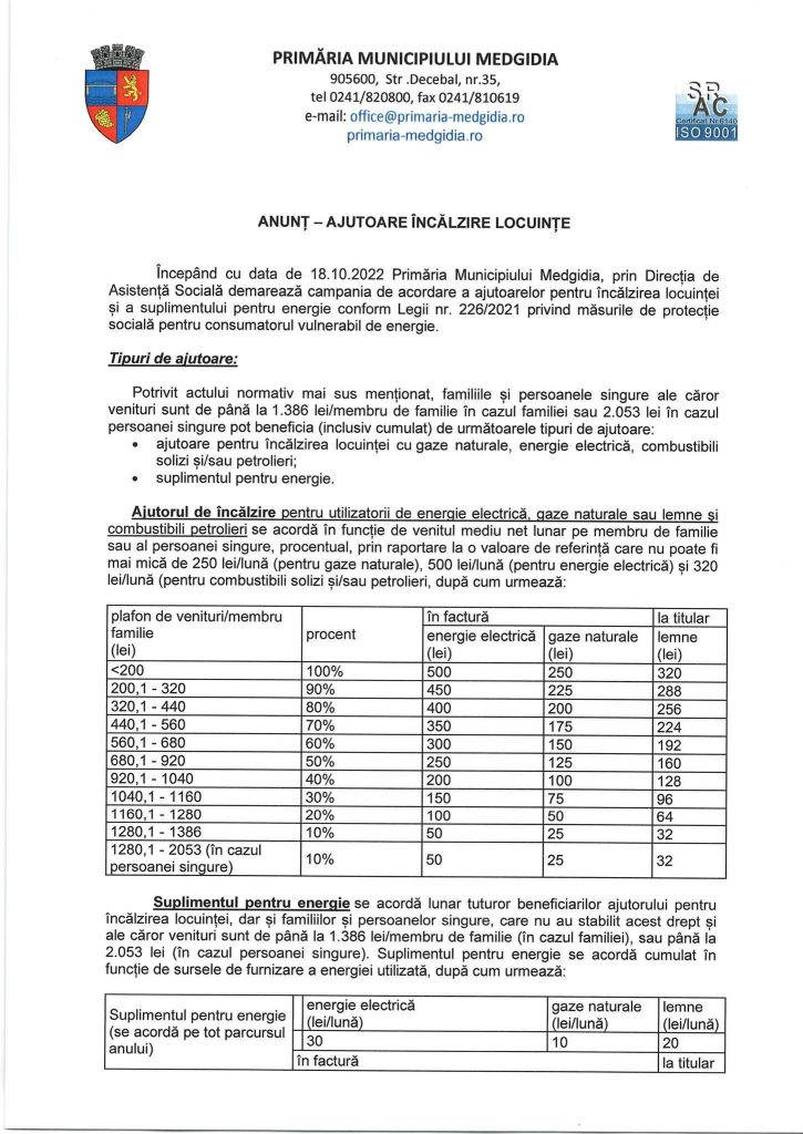 Primăria Municipiului Medgidia vă informează că începând de mâine, 18 octombrie 2022, demarează campania de acordare a ajutoarelor de încălzire a locuinței și a suplimentului pentru energie conform Legii nr.226/2021 privind măsurile de protecție socială pentru consumatorul vulnerabil de energie.