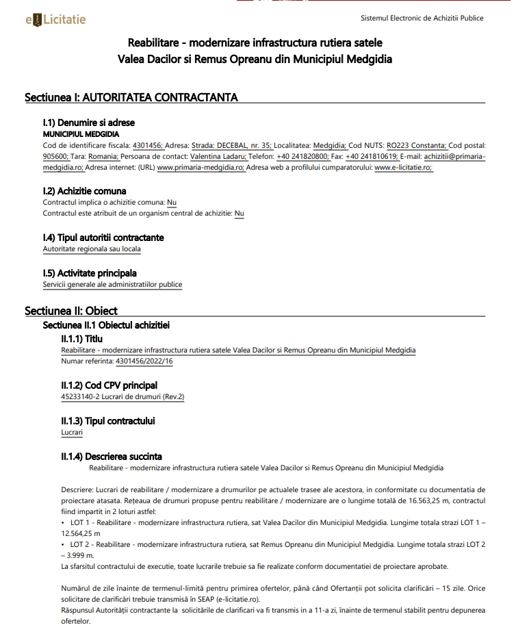 Primăria Medgidia a atribuit un contract de reabilitare – modernizare infrastructură rutieră satele Valea Dacilor și Remus Opreanu din Municipiul Medgidia.