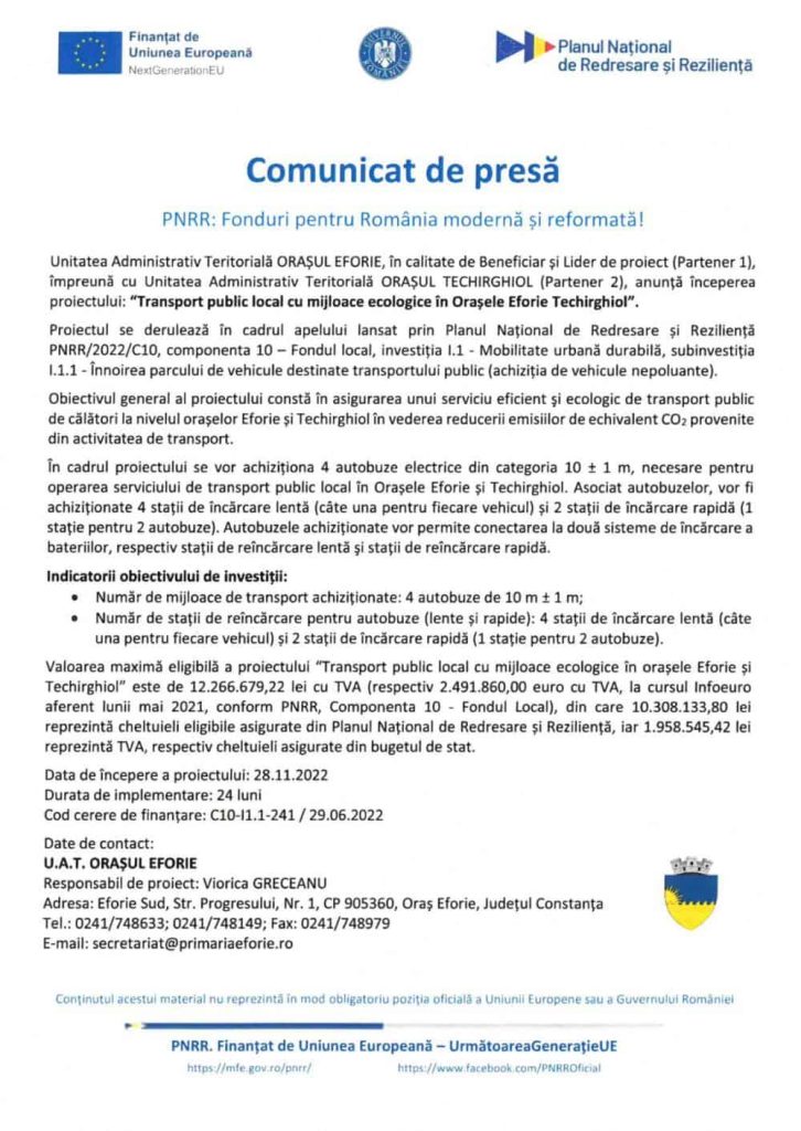 Primăria Eforie anunță începerea proiectului „Transport public local cu mijloace ecologice în orașele Eforie, Techirghiol”