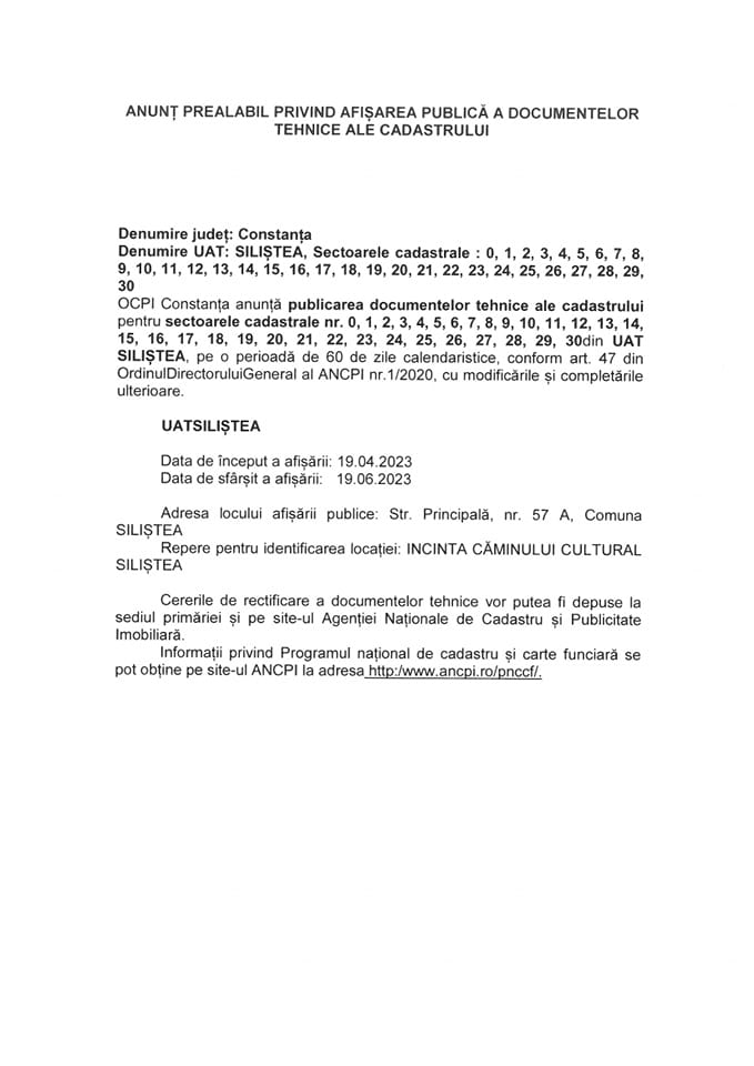 Primăria Siliștea – Informare cadastrare și intabulare gratuită