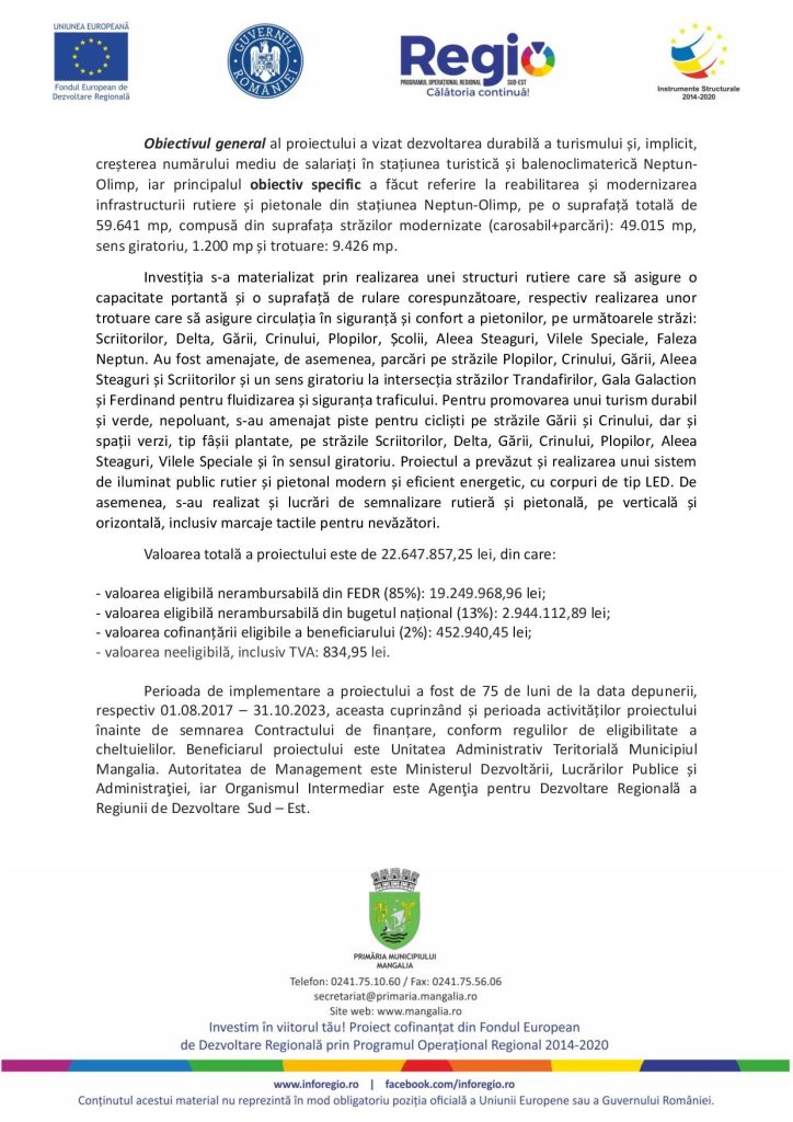 Contractul de Finanțare Nr. 3990/12.03.2019 a fost încheiat cu Ministerul Dezvoltării, Lucrărilor Publice și Administrației, în calitate de Autoritate de Management și cu Agenția pentru Dezvoltare Regională a Regiunii de Dezvoltare Sud-Est, în calitate de Organism Intermediar, proiectul de față implicând o investiție consistentă în reabilitarea și modernizarea infrastructurii publice a stațiunii Neptun-Olimp – străzi, trotuare, sistemul de iluminat aferent rutier și pietonal, amenajarea de parcări, sens giratoriu și amenajarea spațiilor verzi, tip fâșii plantate.
