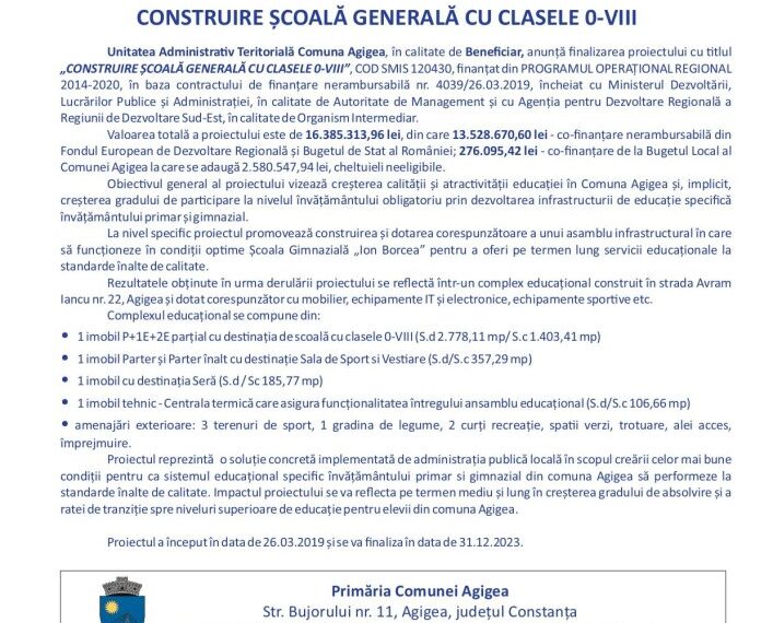 Unitatea Administrativ Teritorială Comuna Agigea, în calitate de Beneficiar, anunță finalizarea proiectului cu titlul „CONSTRUIRE ȘCOALĂ GENERALĂ CU CLASELE 0-VIII”, COD SMIS 120430, finanțat din PROGRAMUL OPERAȚIONAL REGIONAL 2014-2020, în baza contractului de finanțare nerambursabilă nr. 4039/26.03.2019, încheiat cu Ministerul Dezvoltării, Lucrărilor Publice și Administrației, în calitate de Autoritate de Management și cu Agenția pentru Dezvoltare Regională a Regiunii de Dezvoltare Sud-Est, în calitate de Organism Intermediar.