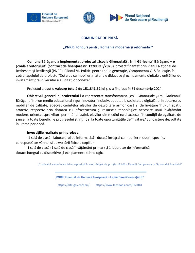 Primăria Bărăganu a implementat proiectul „Școala Gimnazială „Emil Gârleanu” Bărăganu – o școală a viitorului!”