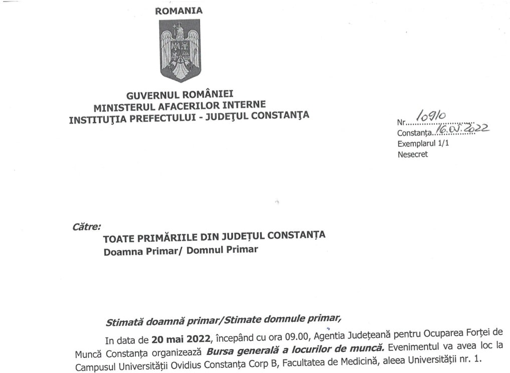 În data de 20 mai 2022, începând cu ora 09.00, Agenția Județeană pentru Ocuparea Forței de MUncă Constanța organizează Bursa generală a locurilor de muncă.